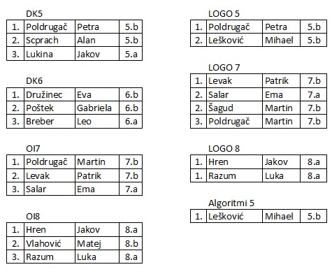 Ovogodišnji pobjednici po kategorijama su: Petra Poldrugač, 5. b (DK5), Eva Družinec, 6. b (DK6), Martin Poldrugač, 7. b (OI7), Jakov Hren, 8. a (OI8), Petra Poldrugač, 5. b (LOGO 5), Patrik Levak, 7. b (LOGO 7), Jakov Hren, 8. a i Luka Razum, 8. a (LOGO 8), Mihael Lešković, 5. b (Algoritmi 5)