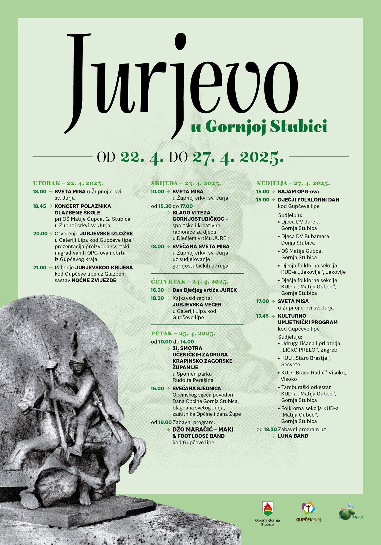 Otvorenje programa započinje u utorak 22. travnja u 18 sati misom u Župnoj crkvi sv. Jurja. Od pregršt zanimljivog progama valja izdvojiti otvaranje tradicionalne Jurjevske izložbe u galeriji Lipa kod Gupčeve lipe, paljenje jurjevskog krijesa, nastup KUD-ova, raznih glazbenih sastava, dječji folklorni dan, koncert polaznika glazbene škole, Sajam cvijeća...