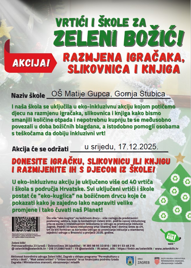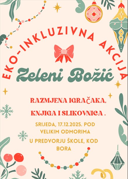 s veseljem vas obavještavamo da se naša škola ove godine uključila u eko-inkluzivnu aktivnost „Zeleni Božić“, kojom potičemo razmjenu igračaka, slikovnica i knjiga. Ovom akcijom želimo razvijati svijest o ponovnoj uporabi predmeta, smanjivanju otpada, solidarnosti te međusobnom darivanju u blagdanskom duhu.