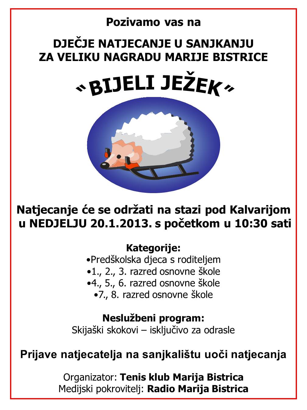 I ove godine se održava natjecanje u sanjkanju na bistričkoj Kalvariji, u nedjelju 20.01.2013.godine.