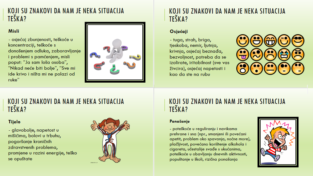 Suočeni s izazovima života, stresom, teškim i nepredvidivim situacijama, svi se ponekad susrećemo s psihičkim poteškoćama. Od velike je važnosti prepoznati poteškoće što ranije kako bi se spriječilo pogoršanje u kasnijoj dobi ili kako bi, bez obzira na poteškoće, uz stručnu pomoć i vodstvo bili dobrog mentalnog zdravlja.