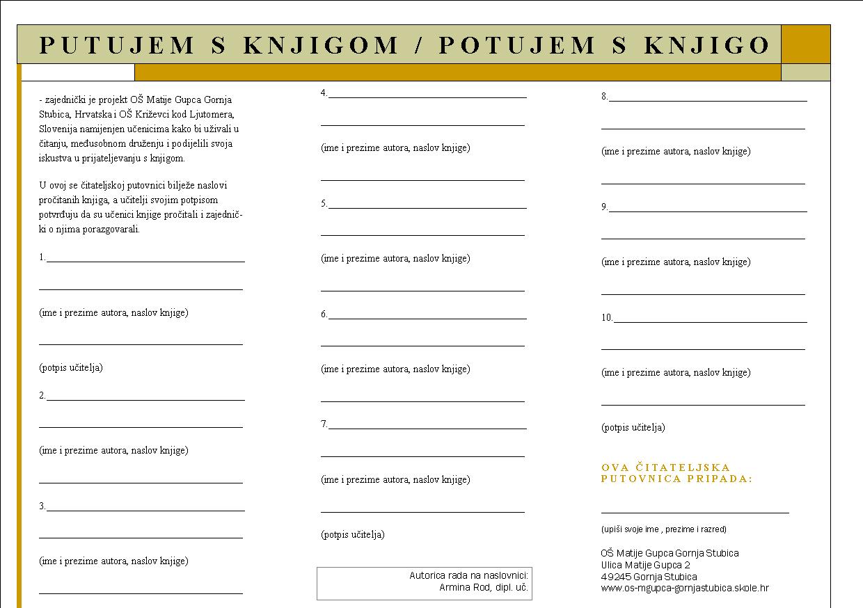 Omotnica čitateljske putovnice - rad učiteljice Armine Rod