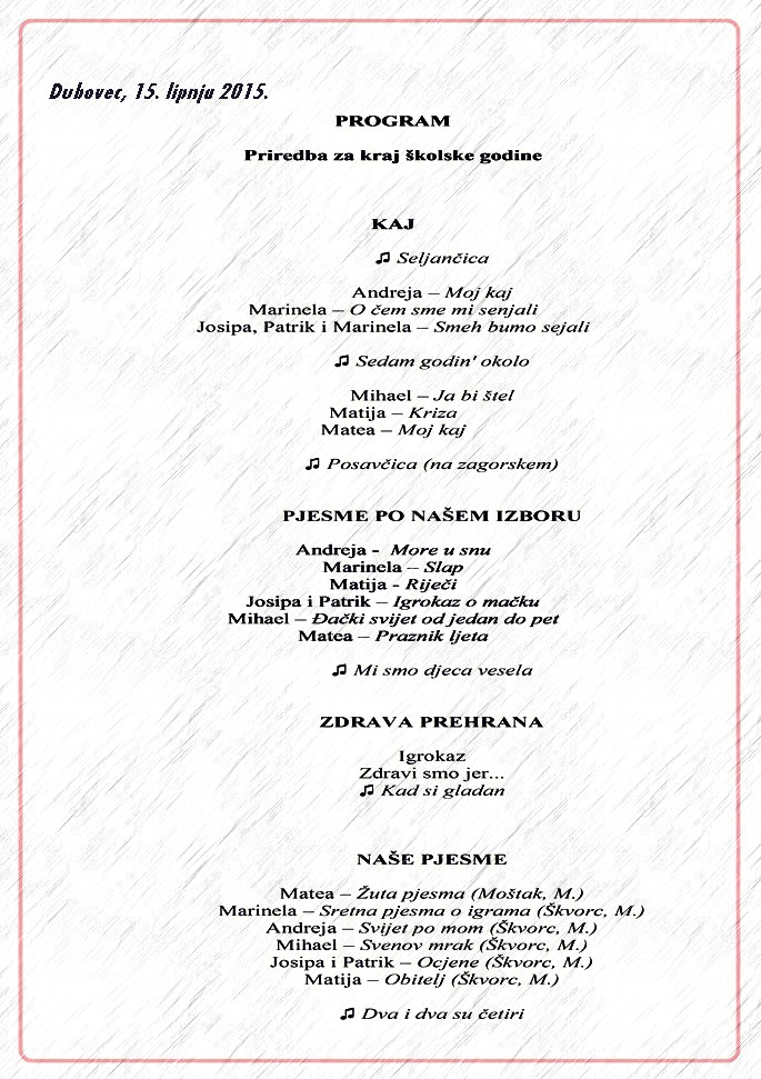 U prvom dijelu učenici su recitirali pjesme svojih vršnjaka na kajkavskom narječju. Drugi dio obilježen je pjesmama po izboru učenika, dok smo u trečem dijelu izveli igrokaz, recitacije i pjesmu o zdravoj prehrani. Zadnji i najvažniji dio činile su pjesme koje su napisali naši učenici.