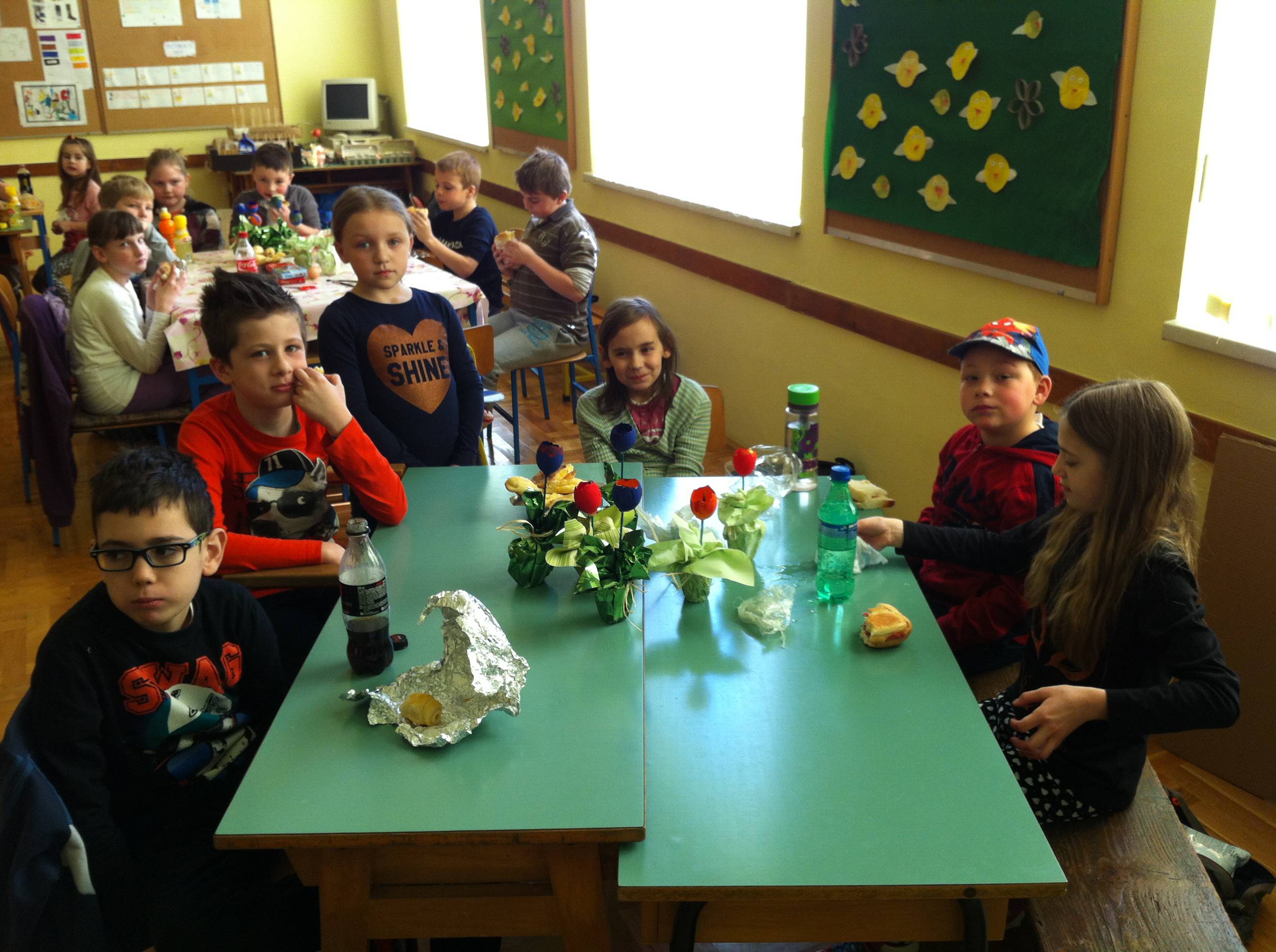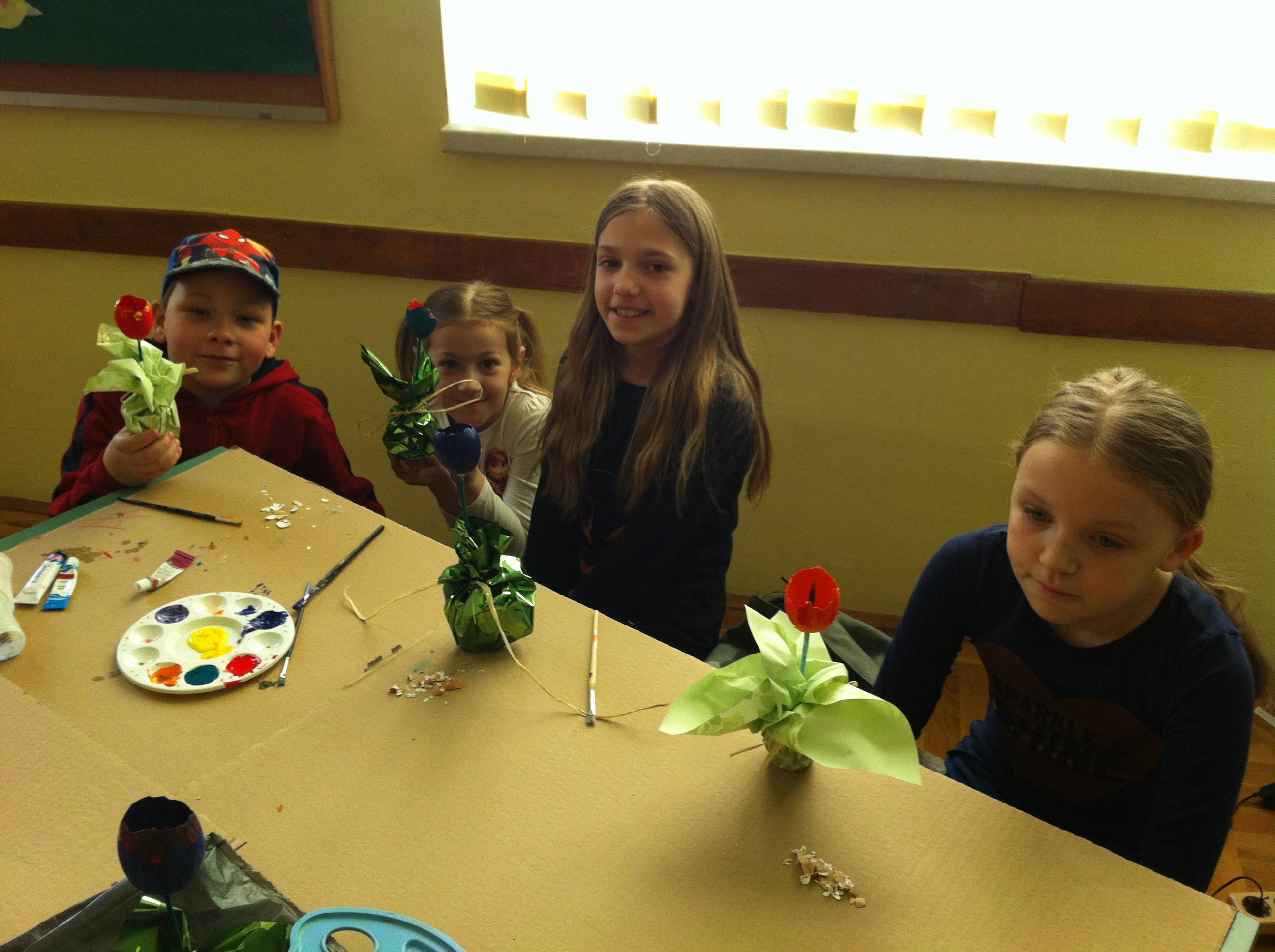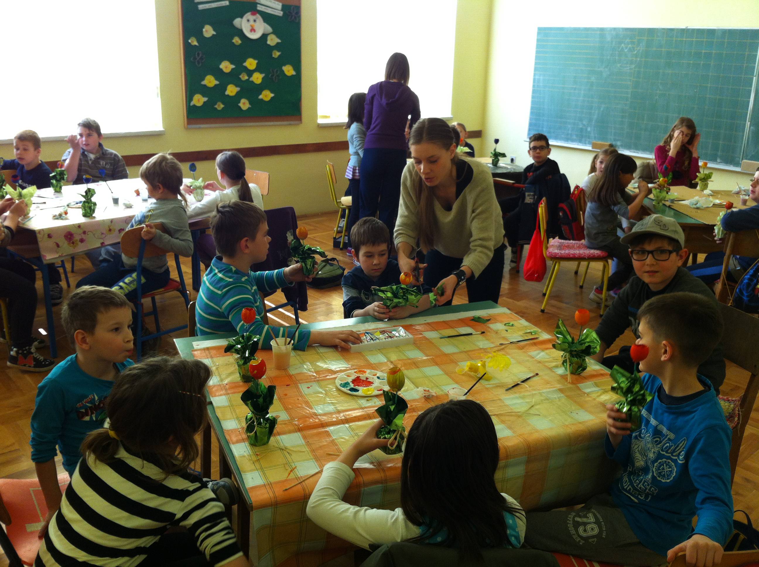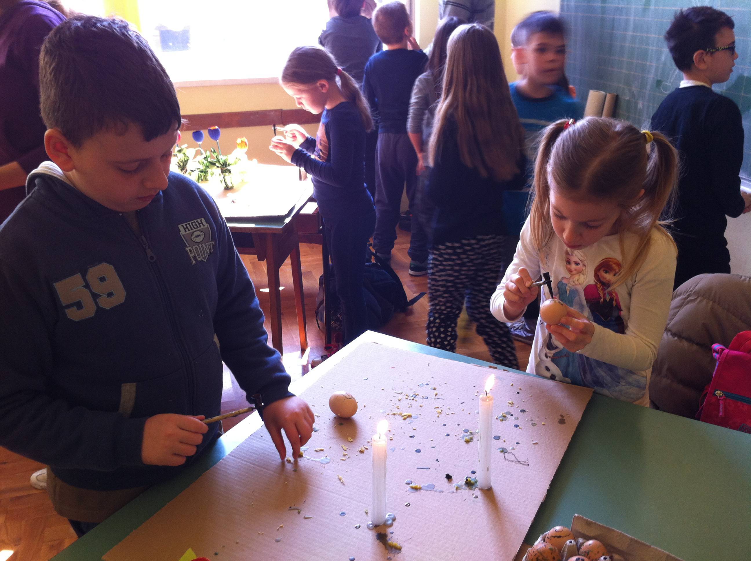 Zahvaljujući roditeljima, učenici PŠ Sveti Matej vrlo brzo su stigli do PŠ Dubovec. Dočekali su ih učenici, učiteljica Mateja, vjeroučitelj Robert i kuharica te pripremljeni stolovi za likovne radionice. Nakon pozdrava, učiteljice su sve učenike podijelile u 5 skupina i započeli su s radom. Prvo su učenici od ispuhanog jajeta izradili cvijet - tulipan, a zatim su uzeli jaje i tehnikom pisanja s voskom te kuhanja i namakanja u boji lukovine napravili svoju pisanicu. Dok su se jaja kuhala i stajala u lukovini, domaćini su nas odveli do mjesnog izvora pitke vode. Izvor je uređen poput prirodnog parka. Uokolo sve se bjelilo od prvih vjesnika proljeća, visibaba i drijemovca. Bilo je prekrasno.