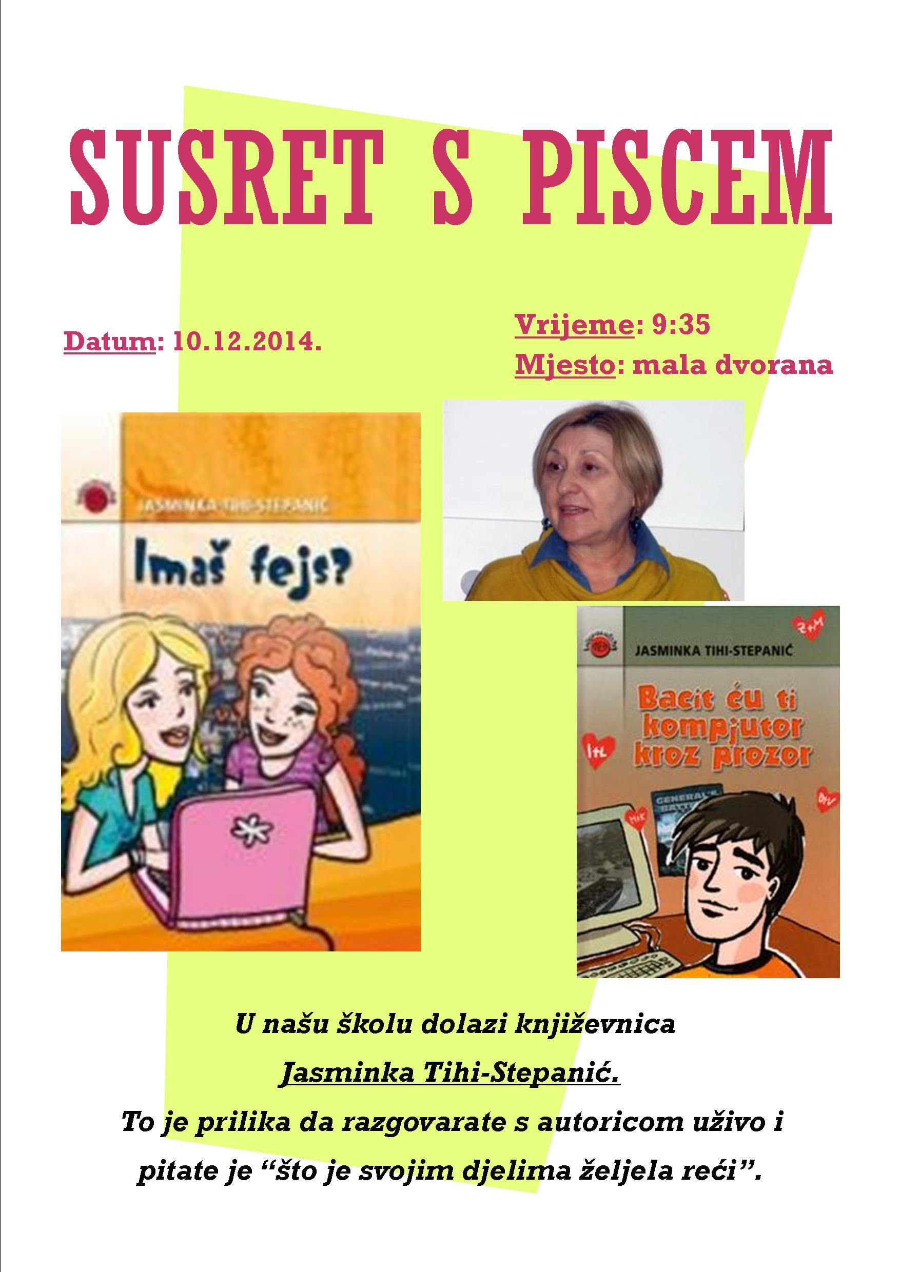 Povodom Mjeseca Hrvatske knjige u našoj školi imat ćemo dva gostovanja. Prvi nam dolazi Siniša Cmrk 19.10., a zatim književnica Jasminka Tihi Stepanić 27.10.2017.