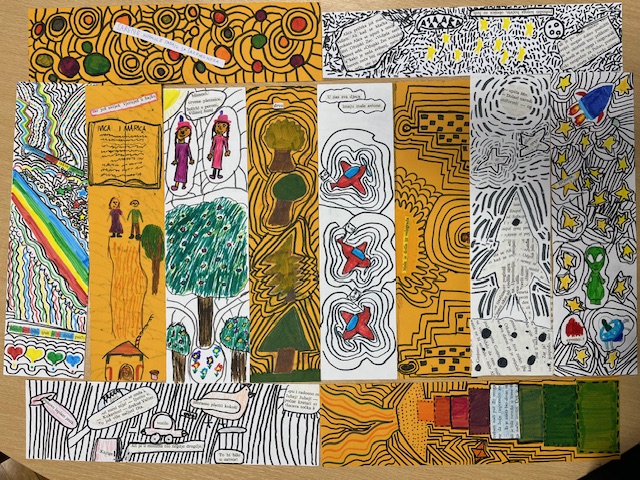Učenici petih razreda s učiteljicom Boženom Lacković na satu Likovne kulture napravili su straničnike koji odgovaraju na temu Međunarodnog mjeseca školskih knjižnica „Školska knjižnica: moje sretno mjesto gdje cvjetaju kreativnost i mašta" i bili kreativni u upotrebi starih i otpisanih knjiga. Izrezali su neke riječi i izraze iz njih te pokušali izvući motive koji bi naše partner iz Portugala mogli uputiti u značenje tih riječi i izraza, ili koji su ih te odabrane riječi samo inspirirale za njihov umjetnički izričaj.