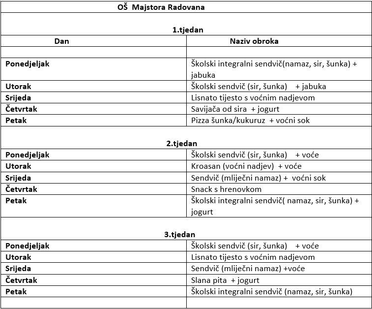 Od ponedjeljka 9. siječnja 2023. godine, započeli smo s podjelom besplatnog obroka u školi. Ovdje možete pogledati jelovnik: