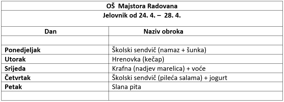 Školski jelovnik od 24. do 28. travnja 2023.