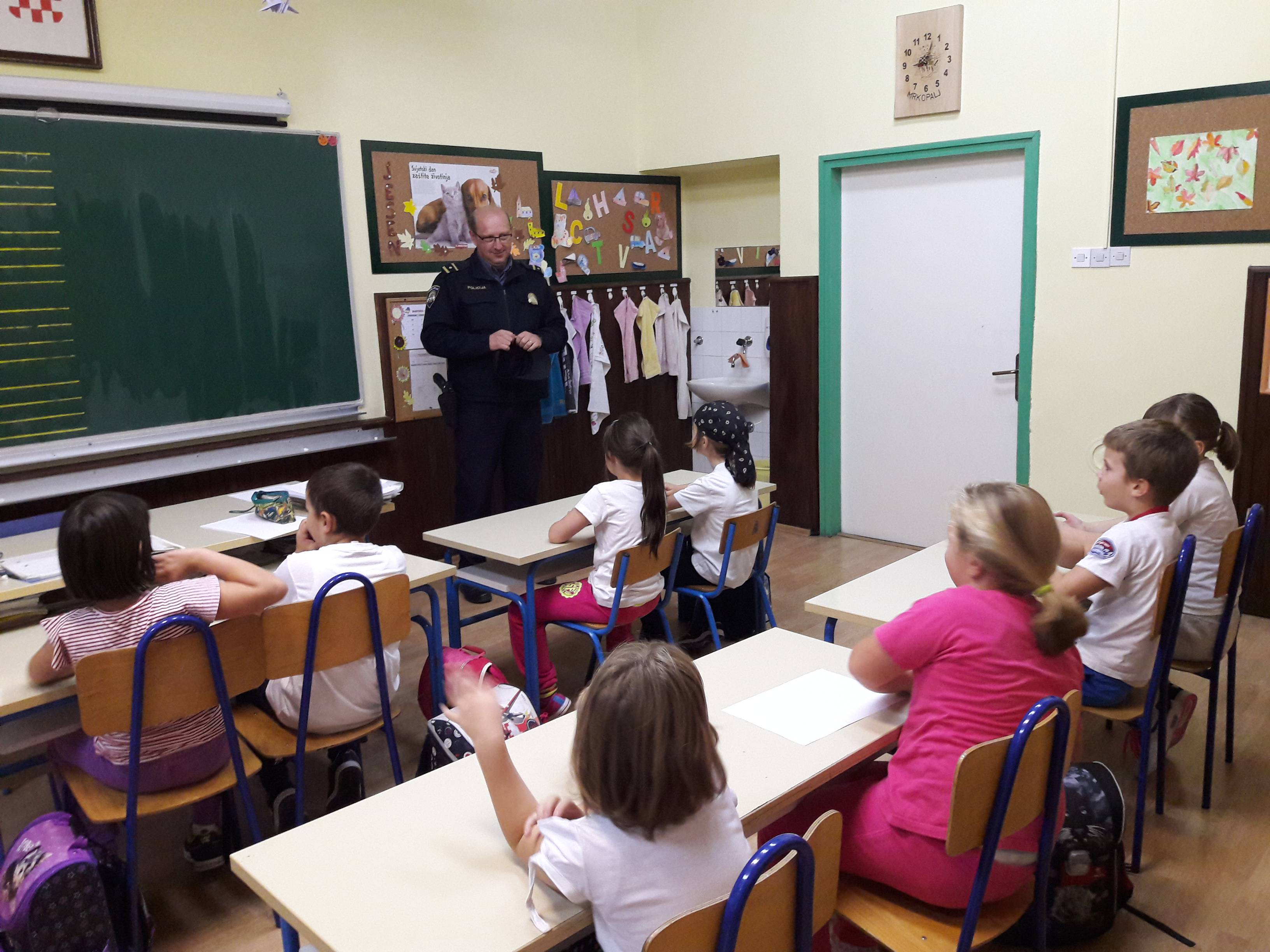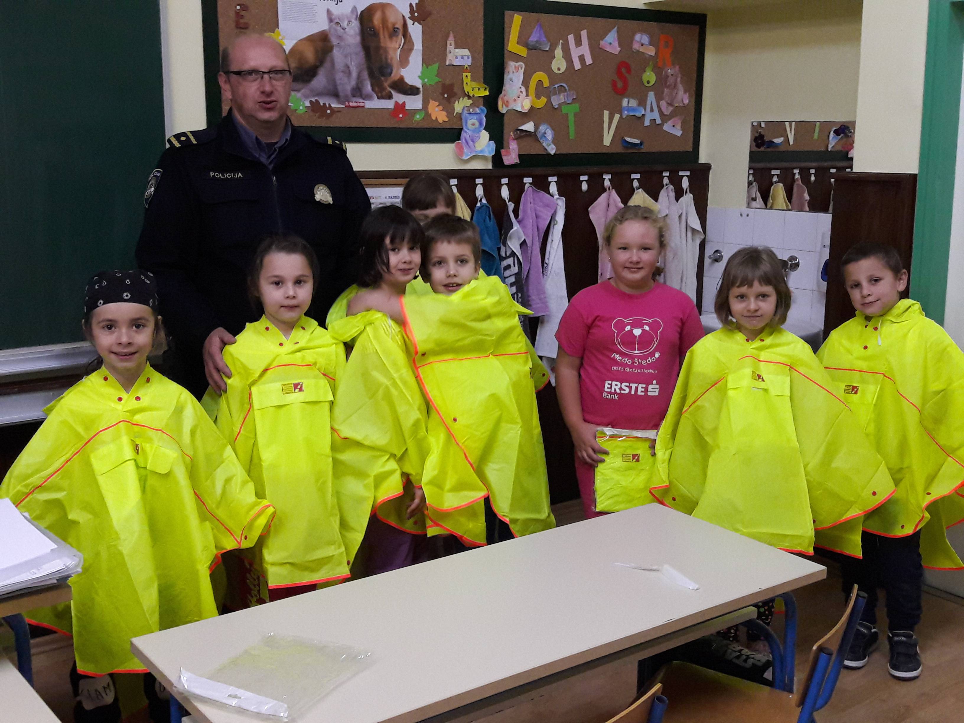 Dana 14. listopada 2016. učenici 1. razreda poslušali su predavanje prometnog policajca Siniše Jurkovića na temu „Prvi koraci u prometu“. Naučili su kako se sigurno ponašati u prometu kao sudionici u prometu bilo da su pješaci ili putnici u osobnom automobilu ili školskom kombiju. Svaki učenik dobio je prigodan poklon, reflektirajuću kišnu kabanicu.