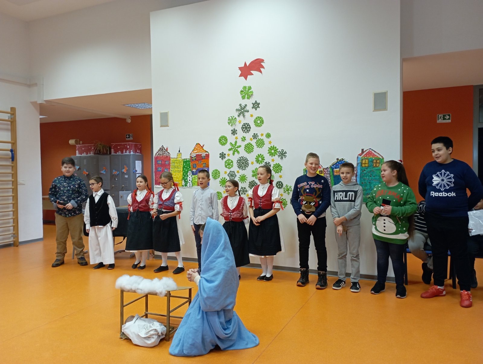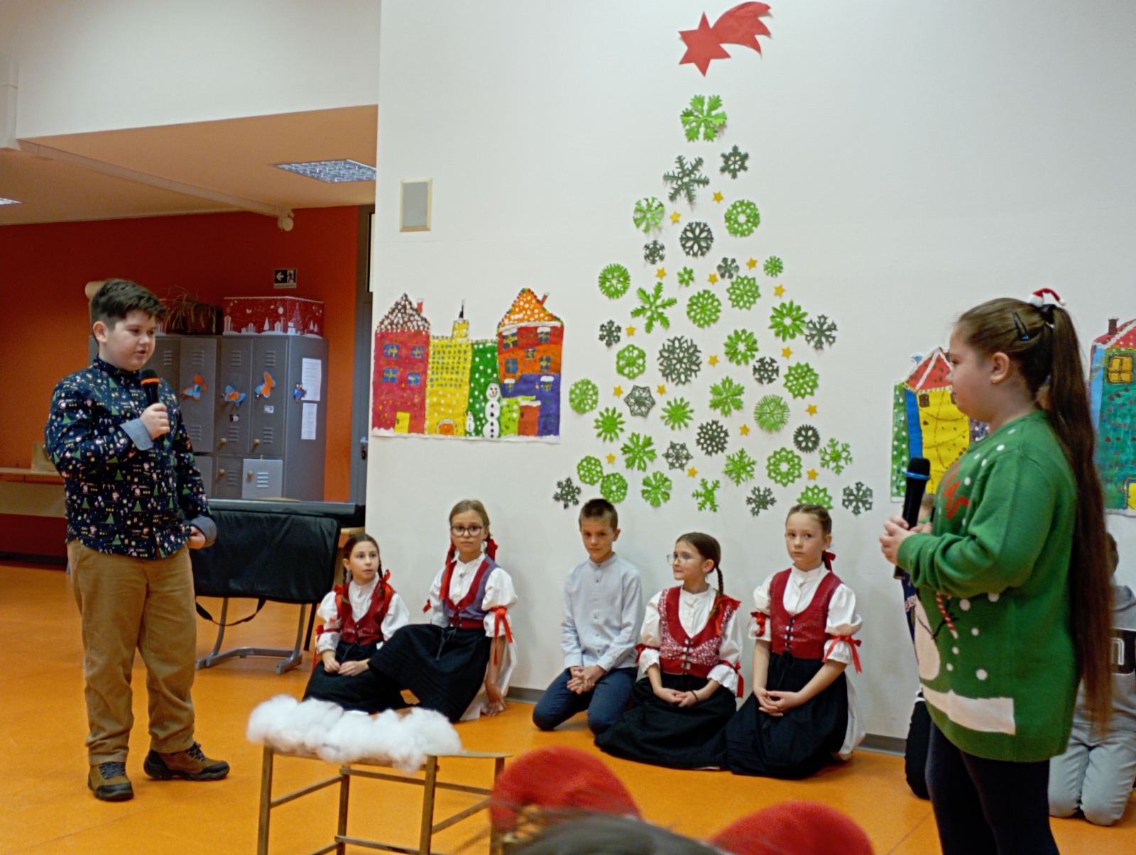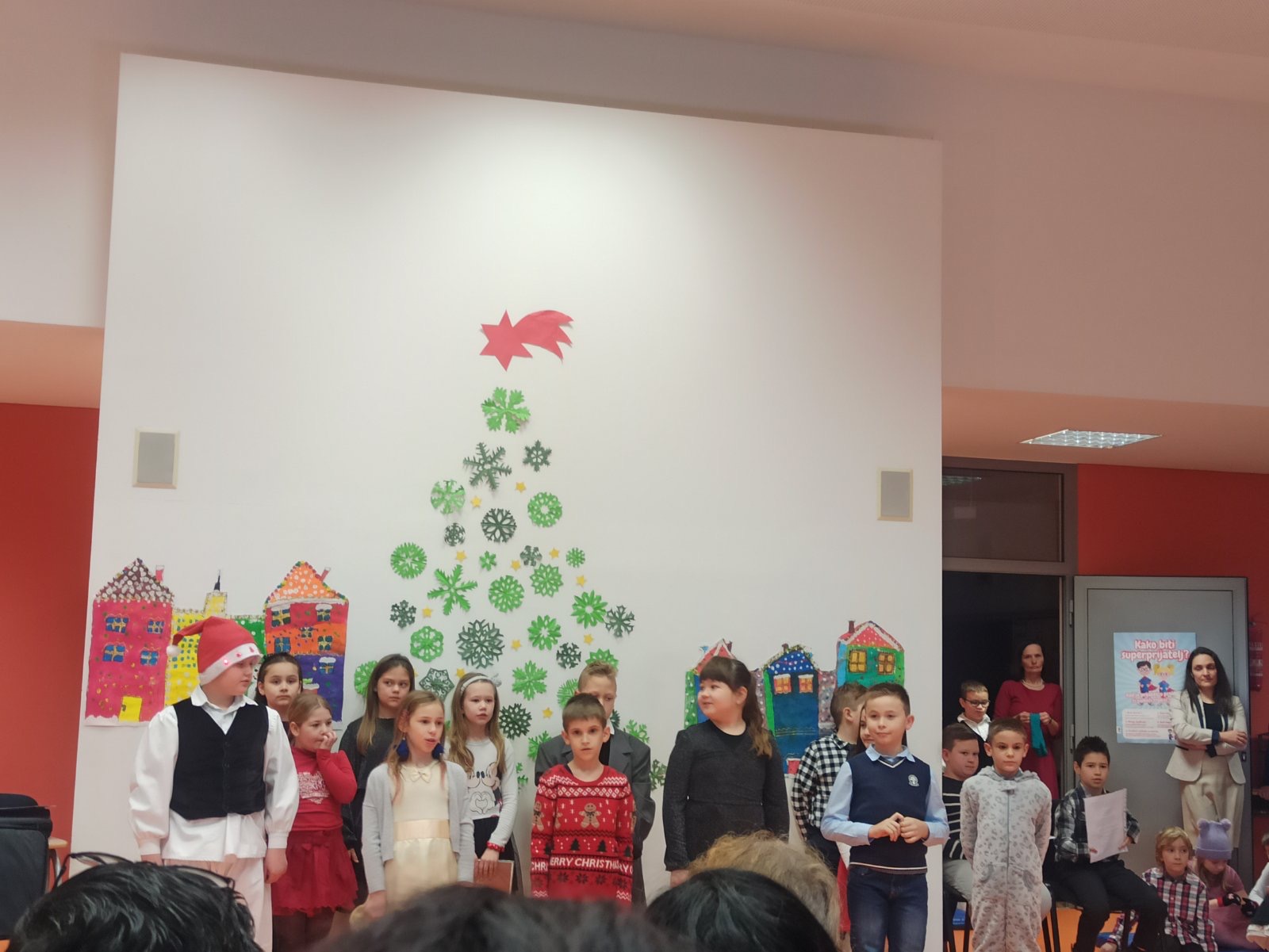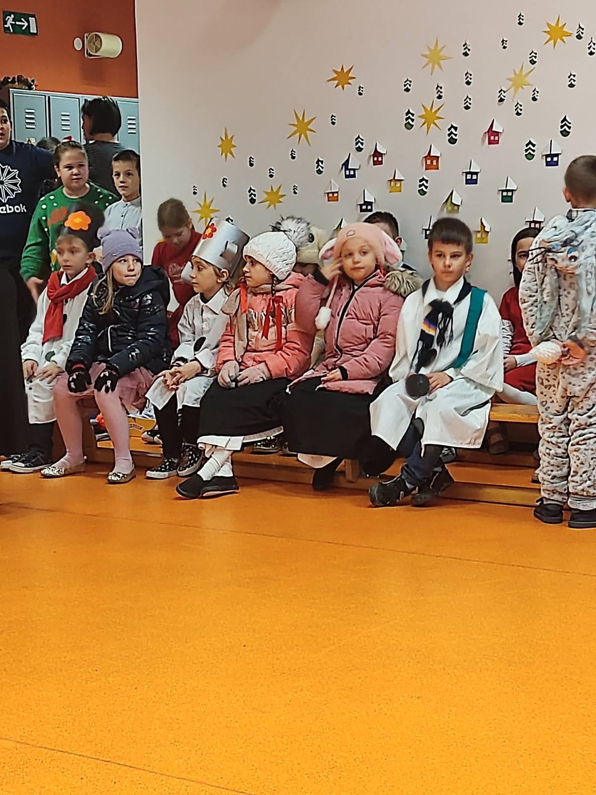Prvašiæi su u svom prvom školskom nastupu isprièali prièu o tri snjegoviæa i zapjevali o pahuljicama kojima se djeca najviše vesele. Uèenici iz boravka pripremili su pjesmu „Ide zima“, a drugi razred prisutne je razveselio recitacijom o pahuljicama i igrokazom o dobrim novogodišnjim odlukama. Takoðer su se u sastavku prisjetili dobrote svetog Nikole i uprilièili scensku igru „Zeko i potoèiæ“. Èlanovi folklorne skupine svojim su plesom pokazali kako njeguju tradiciju i kulturu svoga kraja, a uèenici 3. razreda recitacijom su nagovijestiti pjesmu i veselje usred zimske noæi. Igrokaz èlanova vjeronauène grupe i èetvrtog razreda podsjetio je sve prisutne na istinsku bit Bo¾iæa, a to je ljubav prema bli¾njemu, osobito prema svima onima koji su èesto zaboravljeni, napušteni i usamljeni.