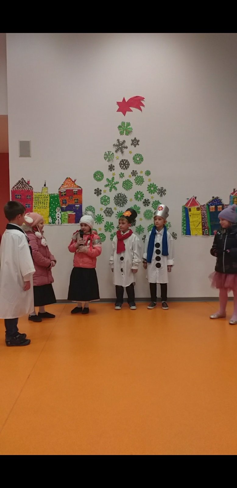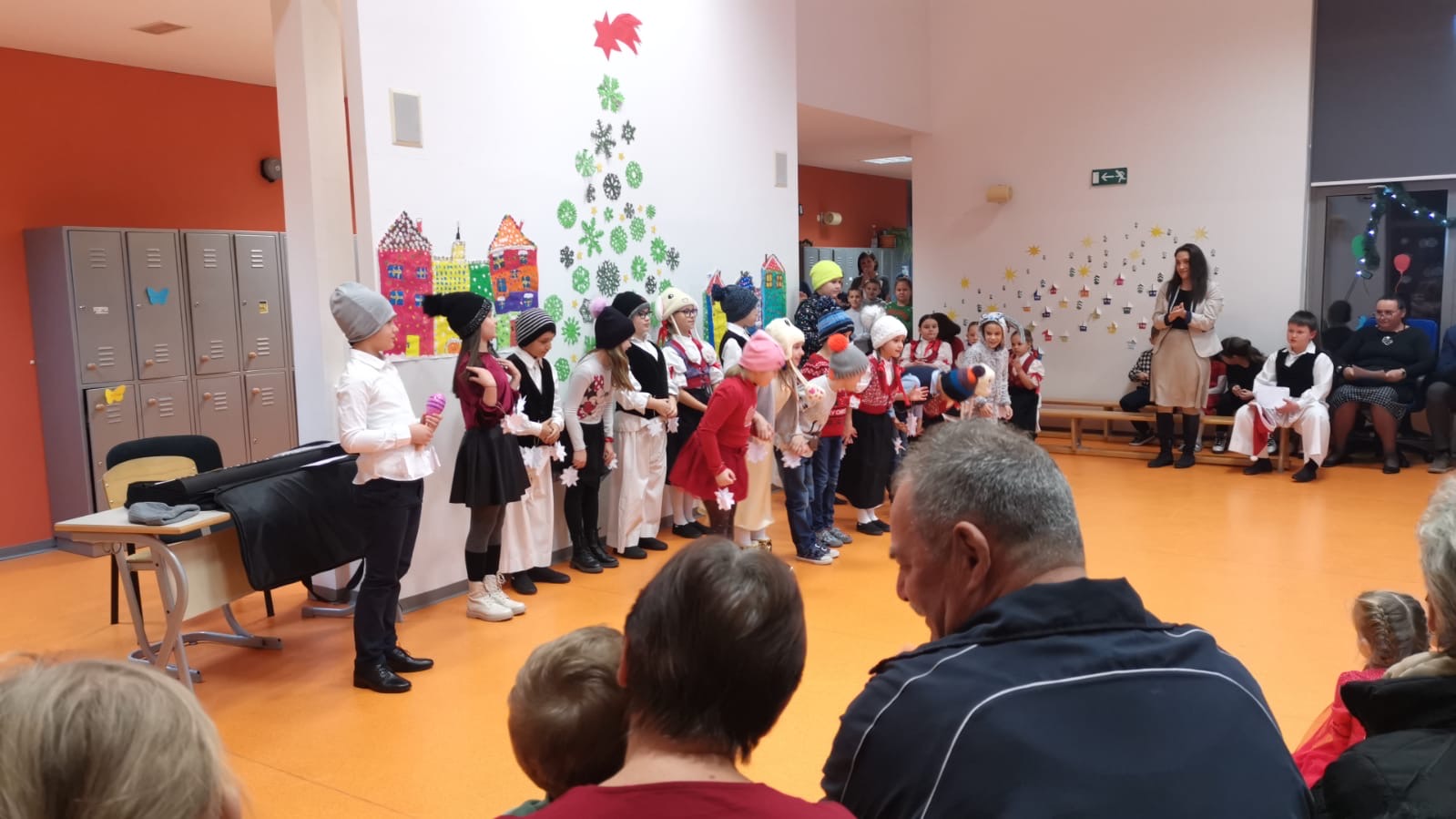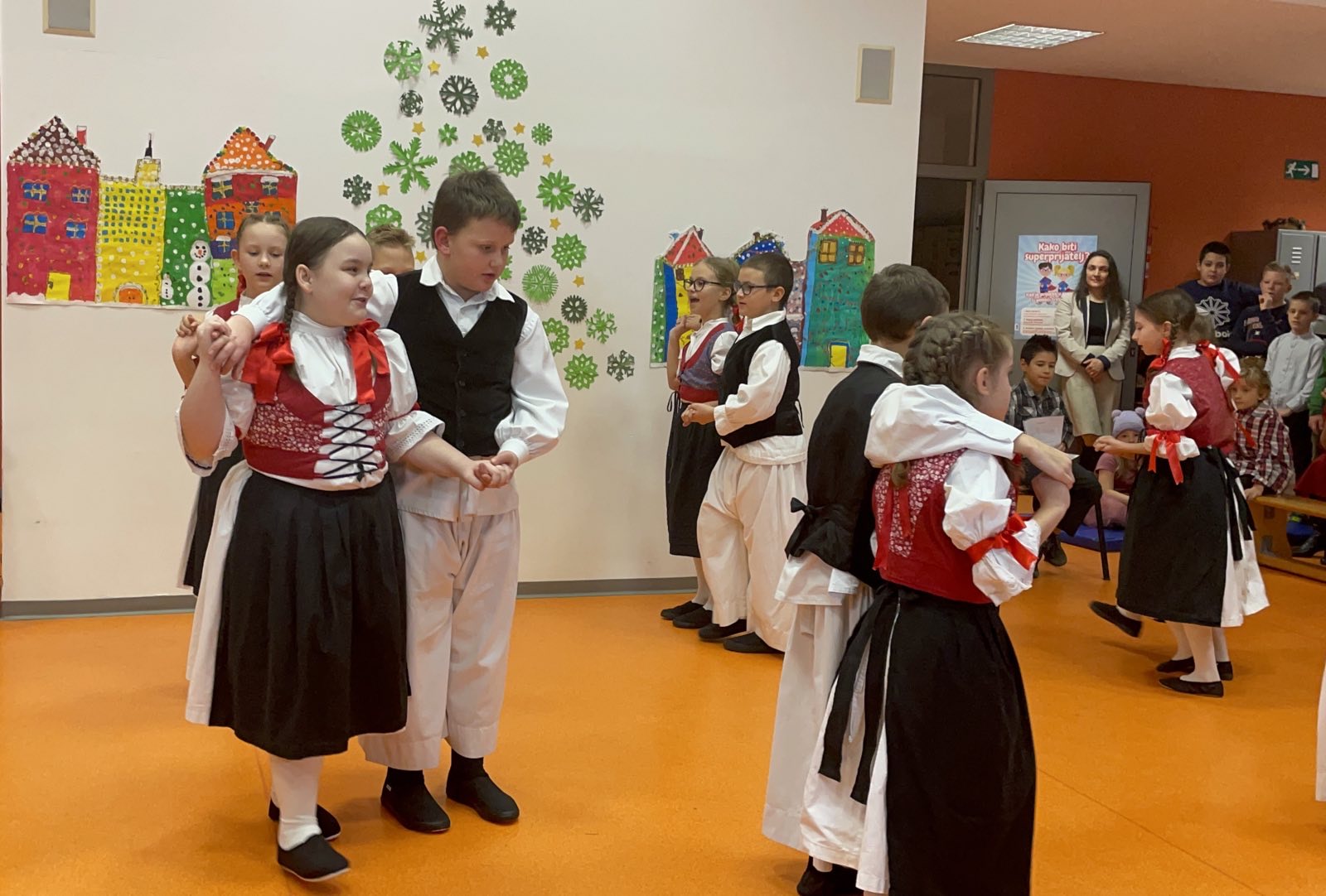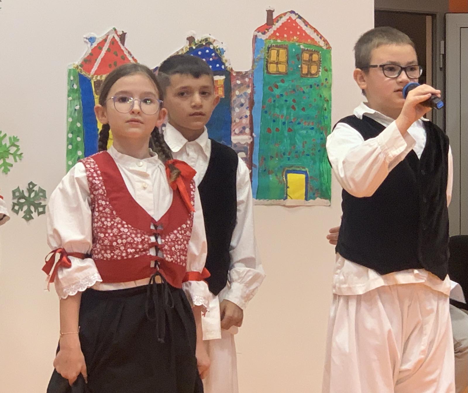 Prvašiæi su u svom prvom školskom nastupu isprièali prièu o tri snjegoviæa i zapjevali o pahuljicama kojima se djeca najviše vesele. Uèenici iz boravka pripremili su pjesmu „Ide zima“, a drugi razred prisutne je razveselio recitacijom o pahuljicama i igrokazom o dobrim novogodišnjim odlukama. Takoðer su se u sastavku prisjetili dobrote svetog Nikole i uprilièili scensku igru „Zeko i potoèiæ“. Èlanovi folklorne skupine svojim su plesom pokazali kako njeguju tradiciju i kulturu svoga kraja, a uèenici 3. razreda recitacijom su nagovijestiti pjesmu i veselje usred zimske noæi. Igrokaz èlanova vjeronauène grupe i èetvrtog razreda podsjetio je sve prisutne na istinsku bit Bo¾iæa, a to je ljubav prema bli¾njemu, osobito prema svima onima koji su èesto zaboravljeni, napušteni i usamljeni.