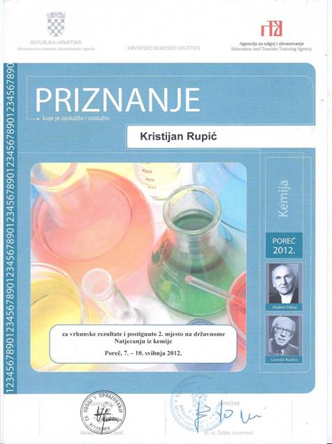 Na natjecanju iz kemije ispit je trajao ukupno tri sata i sastojao se od dva istraživačka pokusa u kojima je Kristijan Rupić pokazao izvrsnost. Ovaj učenik sudjelovao je ukupno na 26 natjecanja iz matematike, kemije, fizike, hrvatskog i engleskog jezika, od čega 10 školskih, 10 županijskih, 2 regionalna i 4 državna natjecanja.