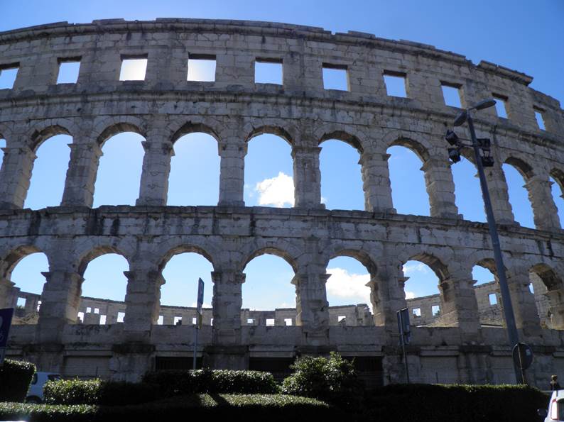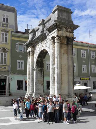 Krećemo u smjeru Pule koja ja zasigurno najpoznatija po Areni. Arenu smo razgledali izvana gdje smo sjedili na mjestima rimskoga puka i iznutra gdje su se pripremali gladijatori i životinje, a u tim se podrumima također može vidjeti mali muzej o povijesti proizvodnje i prijevoza maslinova ulja. Napustili smo Arenu i krenuli prema forumu, a pritom smo prošli pokraj Herculovih vrata, kroz Slavoluk Sergijevaca. Na forumu se mogu vidjeti različiti stilovi gradnje, od Augustovog hrama, gradske vijećnice iz doba Mlečana pa sve do zgrada iz 17. i 18. stoljeća. Dolaskom u hotel ručali smo, zamijenili obuću i bateriju u fotoaparatu i krenuli u smjeru Rovinja. Nakon još malo penjanja uzbrdo, došli smo do crkve sv. Eufemije sa zvonikom koji je najviši u Istri. Tijekom slobodnog vremena u Rovinju imali smo jedan nespretan pad. Ništa strašno. Slijedi još jedno vraćanje u hotel i brzo spremanje za kupanje, skakanje u bazen, ali skakanje nije dobro prošlo za jednog učenika koji je morao na šivanje. Naš Matej hrabro se držao, ali ipak ne vjerujem da će više skakati salto unatrag. Nakon bazena večera, nakon večere disko, a neki su učenici zaključili da disko nije za dobar provod nego je lukav način za umaranje učenika kako bi što prije zaspali.