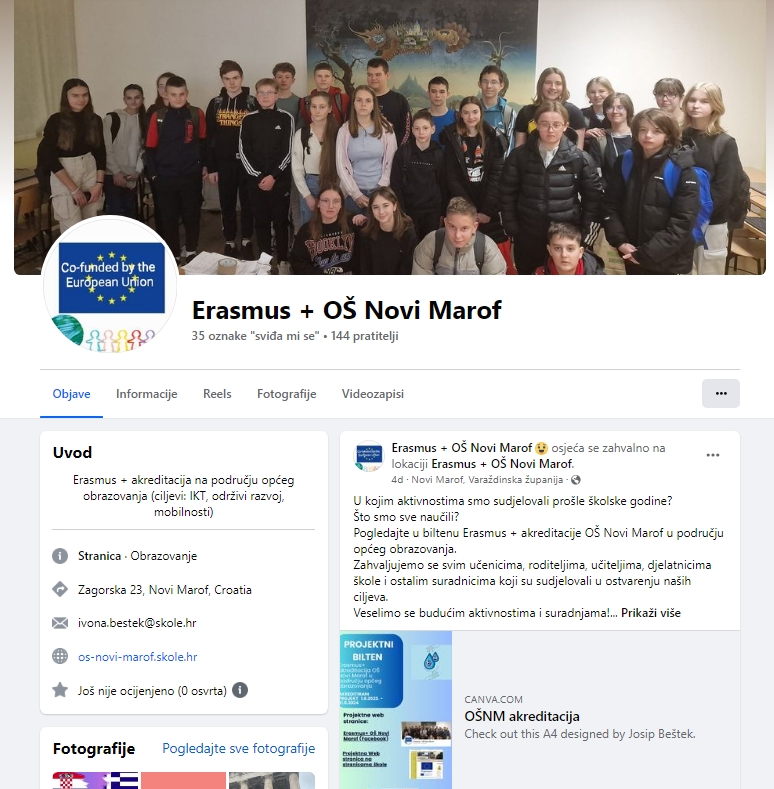 U svrhu lokalne i međunarodne promocije projekta otvorena je projektna Facebook stranica "Erasmus+ OŠ Novi Marof" na kojoj učenici i nastavnici redovito objavljivljuju postove tijekom i nakon projektnih aktivnosti u svrhu praćenja projektnih aktivnosti u široj lokalnoj i međunarodnoj zajednici.