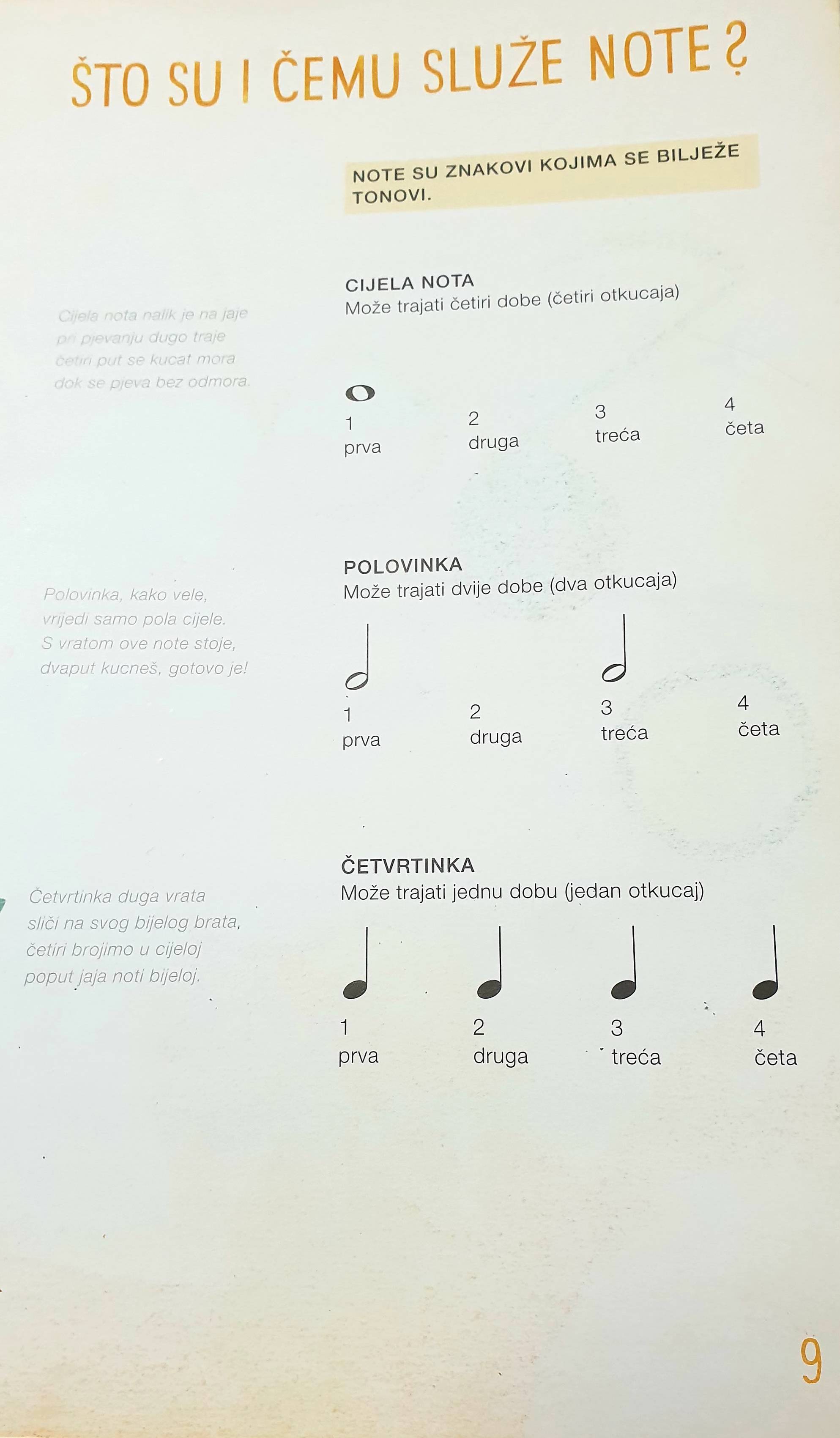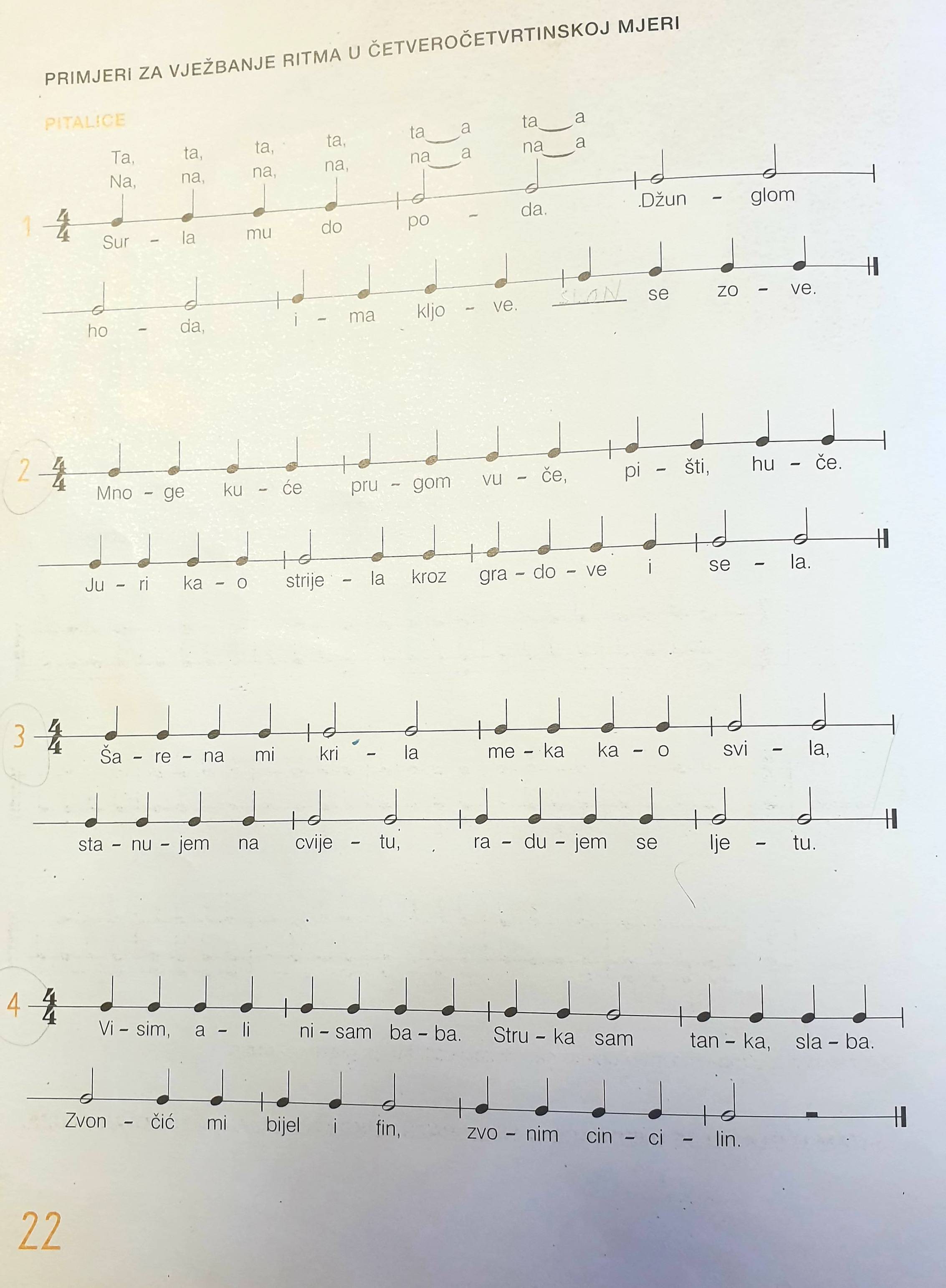 Ponovit ćemo Pjesmu radosti na str.7. Za početak svi prepišite 1.red pjesme u kajdanku ako tko želi može prepisati sva 3 reda a ispod nota upisati glazbenu sbecedu malim pisanim slovima(npr.c1) te ispod gl.abecede upisati solmizaciju velikim tiskanim slovima (npr.DO) i to poslati meni na pregled. Nakon pismenog dijela Pjesmu radosti treba najprije pročitati ritamskim slogovima da ponovimo četvrtinku čitamo sa Ta a polovinku sa Ta-a. Nakon ritamskog čitanja slijedi čitanje sa gl.abecedom i solmizacijom u tempu. U privitku sam dodao brojalice koje ponavljamo na str.22 iz udžbenika naprije sa ritamskim slogovima a zatim sa tekstom. Stojim na raspolaganju svima Vama ako gdje zapne ili dođe do problema javite se na moj mail goran.safaric@skole.hr. L.p.