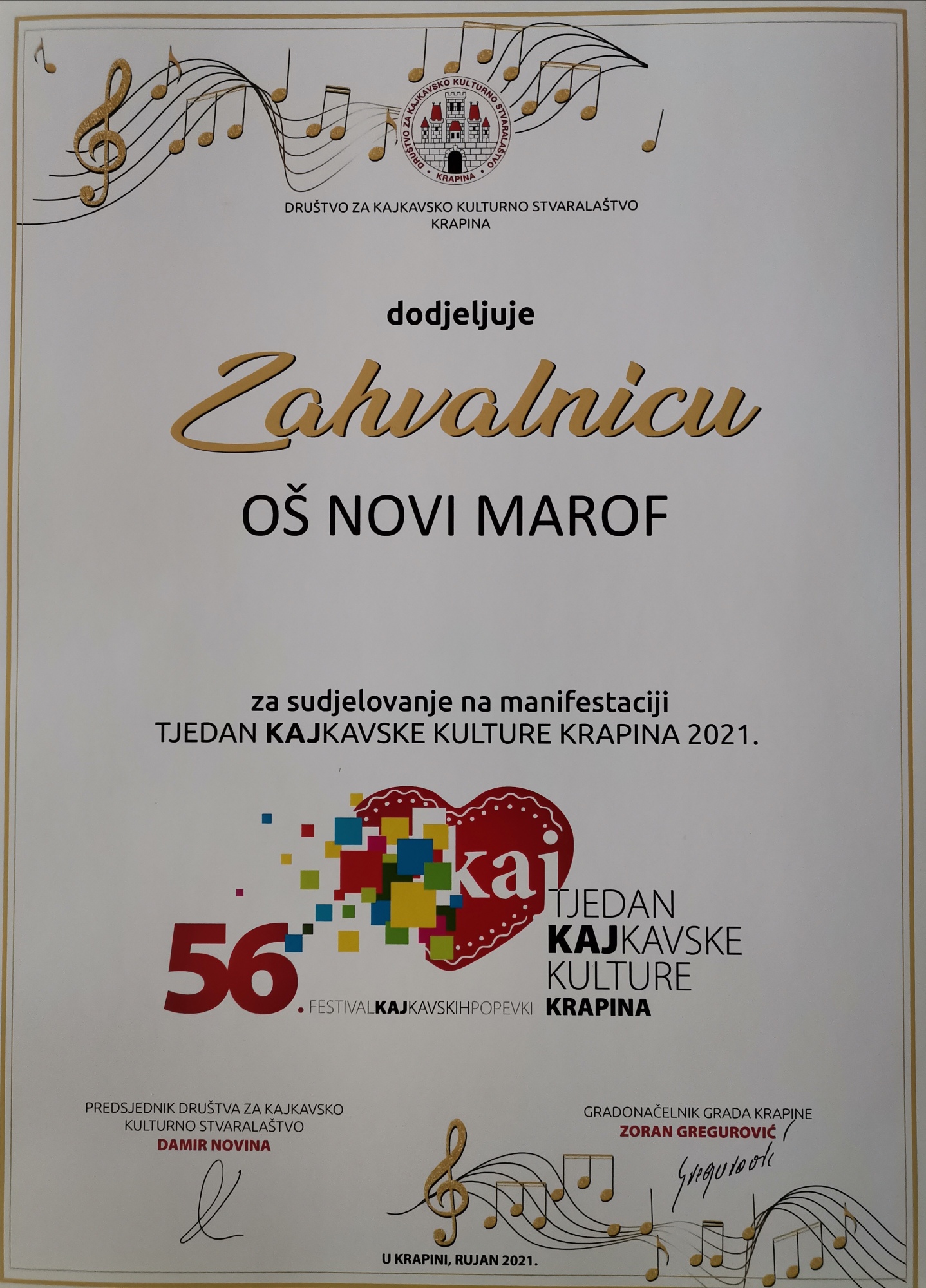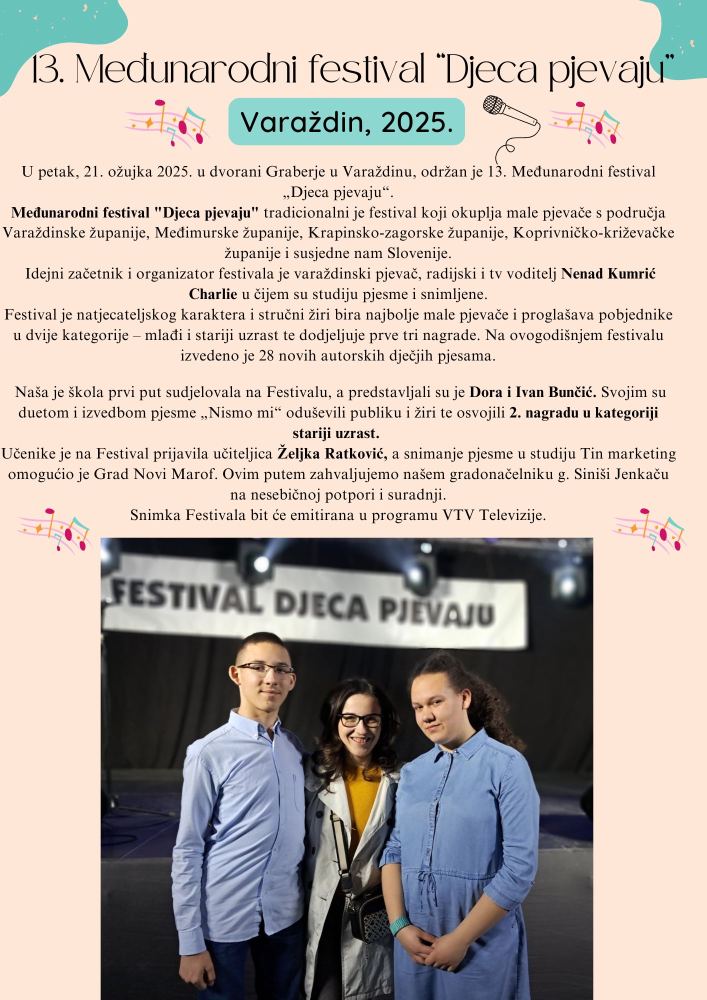Uz mnogobrojnu publiku, obitelj i prijatelje učenicu je na Festivalu podržao i gradonačelnik Novoga Marofa i saborski zastupnik g. Siniša Jenkač.
