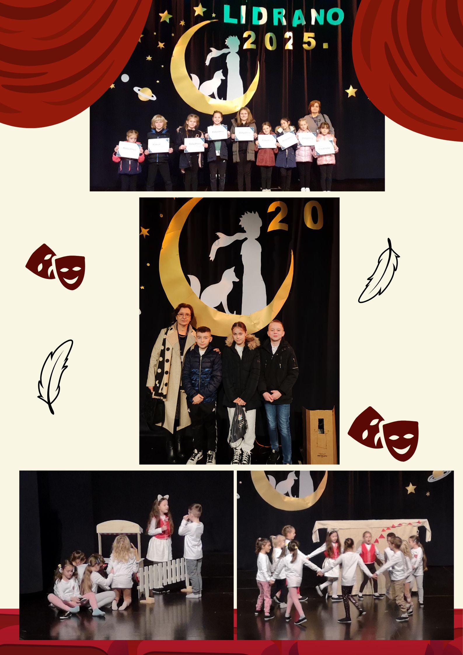 U kategoriji Literarni izraz za županijsku razinu predložen je rad Patrika Matekovića (5. b) pod nazivom Prva ljubav, a pripremala ga je mentorica Sunčica Križan – Kadi. U kategoriji Dramski izraz – pojedinačni nastupi, istaknuo se Ivan Kloptan (5.c) s tekstom Z. Baloga, Kako se što zove. Ivan je marljivo vježbao s učiteljicom Sunčicom Križan-Kadi. Od skupnih scenskih nastupa na županijskoj razini predstavljat će nas učenici 1. a razreda s Macom papučaricom. Tekst je prilagodila i učenike pripremala učiteljica Ljubica Bešenić. Učenici PŠ Madžarevo jedna su velika sretna obitelj! Sretna obitelj naziv je igrokaza koji je prilagodila i s učenicima od 1. do 4. razreda uvježbala učiteljica Jasminka Biškup. Čestitamo svim učenicima i mentoricama te im želimo puno uspjeha u nastavku natjecanja!