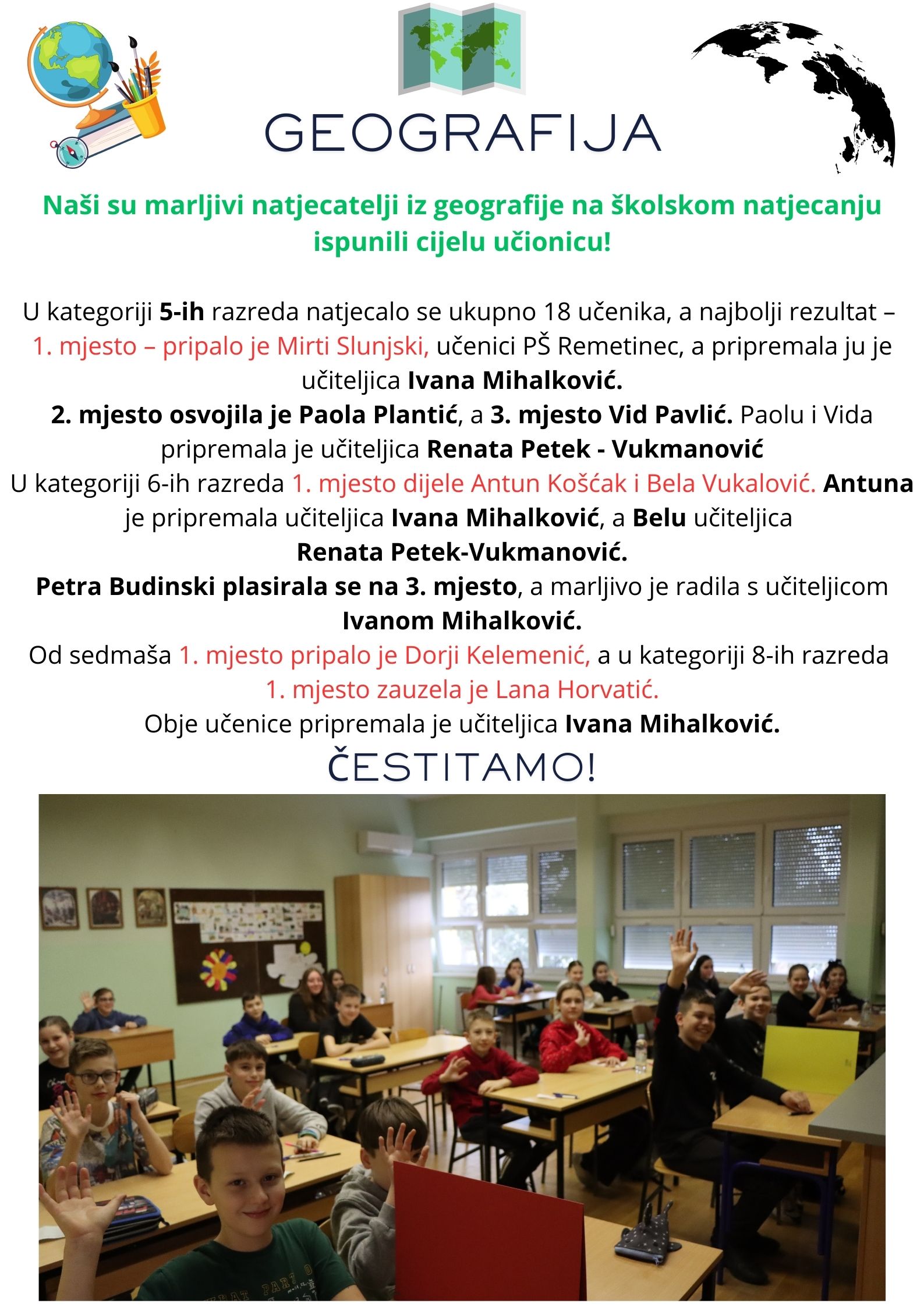 Najuspješnijim učenicima: Dori Bunčić (osvojila 1. mjesto); Andriji Bunčiću (osvojio 2. mjesto) i Lei Marić (osvojila 3. mjesto) uručene su i prigodne nagrade.