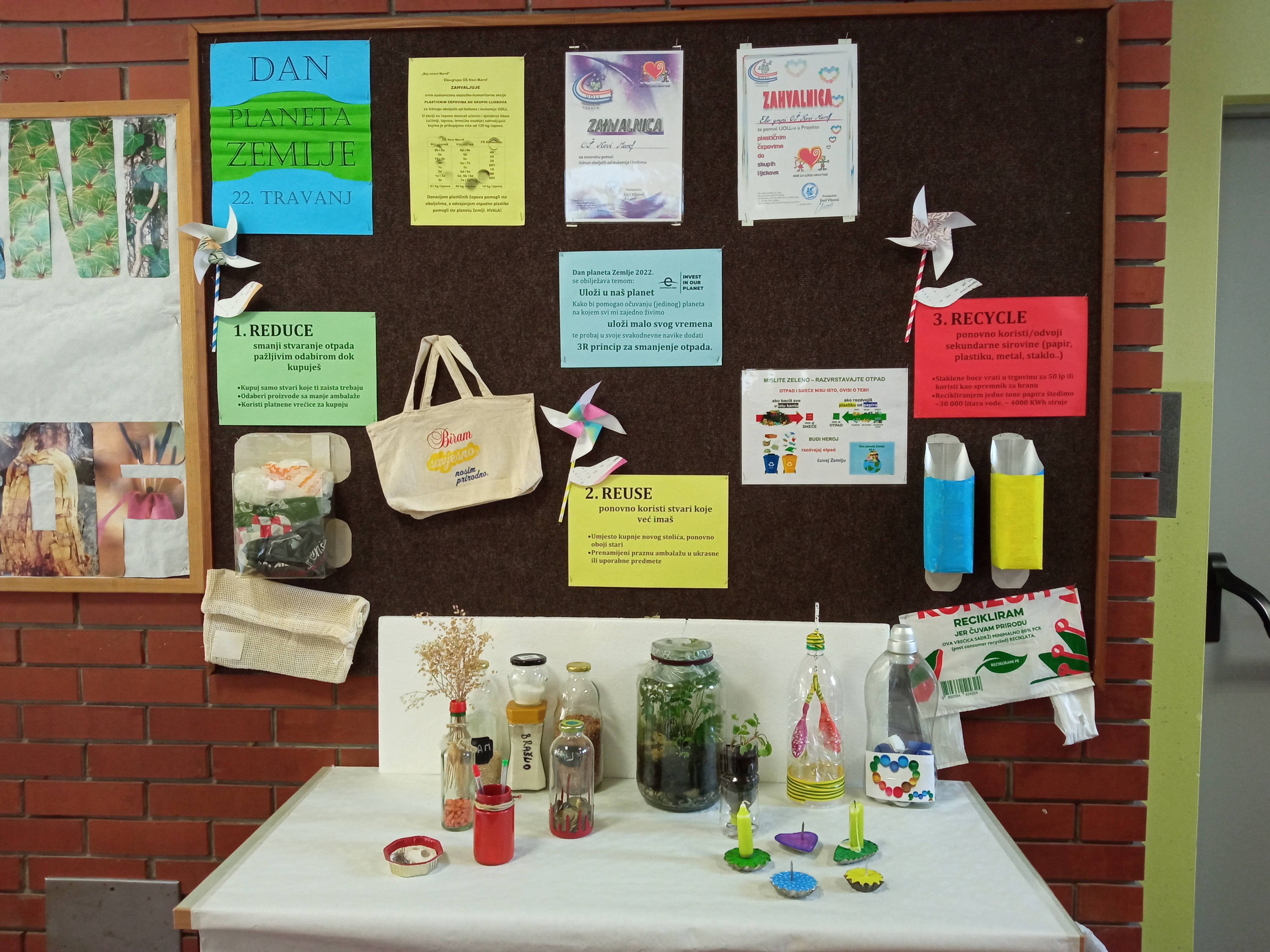 Dan planeta Zemlje 2022. obilježili smo temom: Uloži u naš planet. Kako bi pomogli očuvanju (jedinog) planeta na kojem svi mi zajedno živimo učenici OŠ Novi Marof i PŠ Remetinec uložili su malo svog vremena te u svoje svakodnevne navike pokušali uklopiti 3R princip za smanjenje otpada. S učenicima je radila učiteljica biologije Ivana Žmegač, prof.