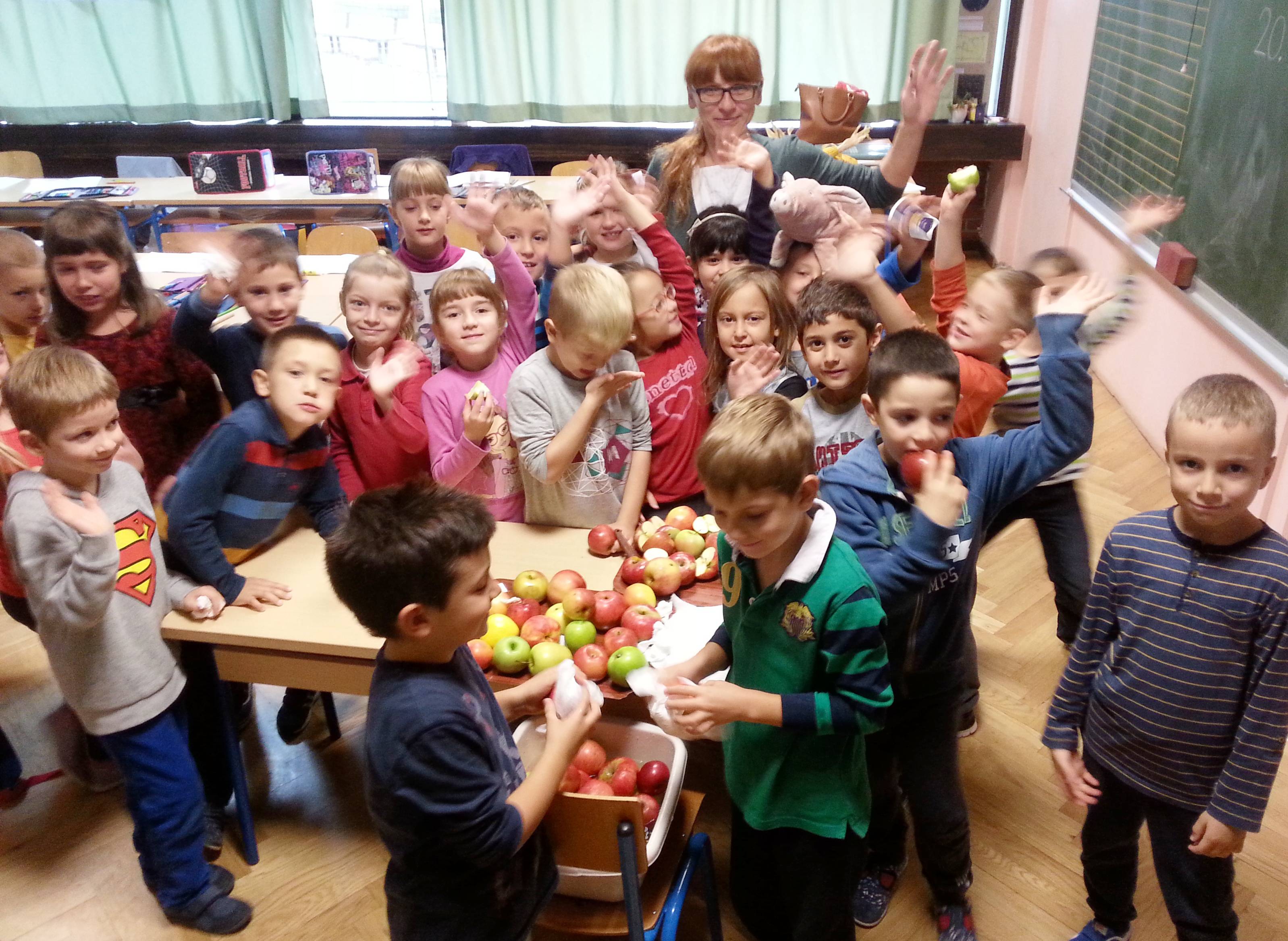 Učenici 1.a razreda s učiteljicom Snježanom su donijeli jabuke i nestrpljivo čekali trenutak pripreme i kušanja. Nakon pripreme, pranja, rezanja i slaganja zajedno su kušali sve vrste, boje i mirise različitih plodova jabuka. Zaključili su da je najukusnije jesensko voće i da vrijedi ona stara poslovica:“Jedna jabuka svaki dan, bolest iz kuće van!“ Nakon ovako ukusnih plodova, kolažom su oslikali i upotpunili doživljaje.