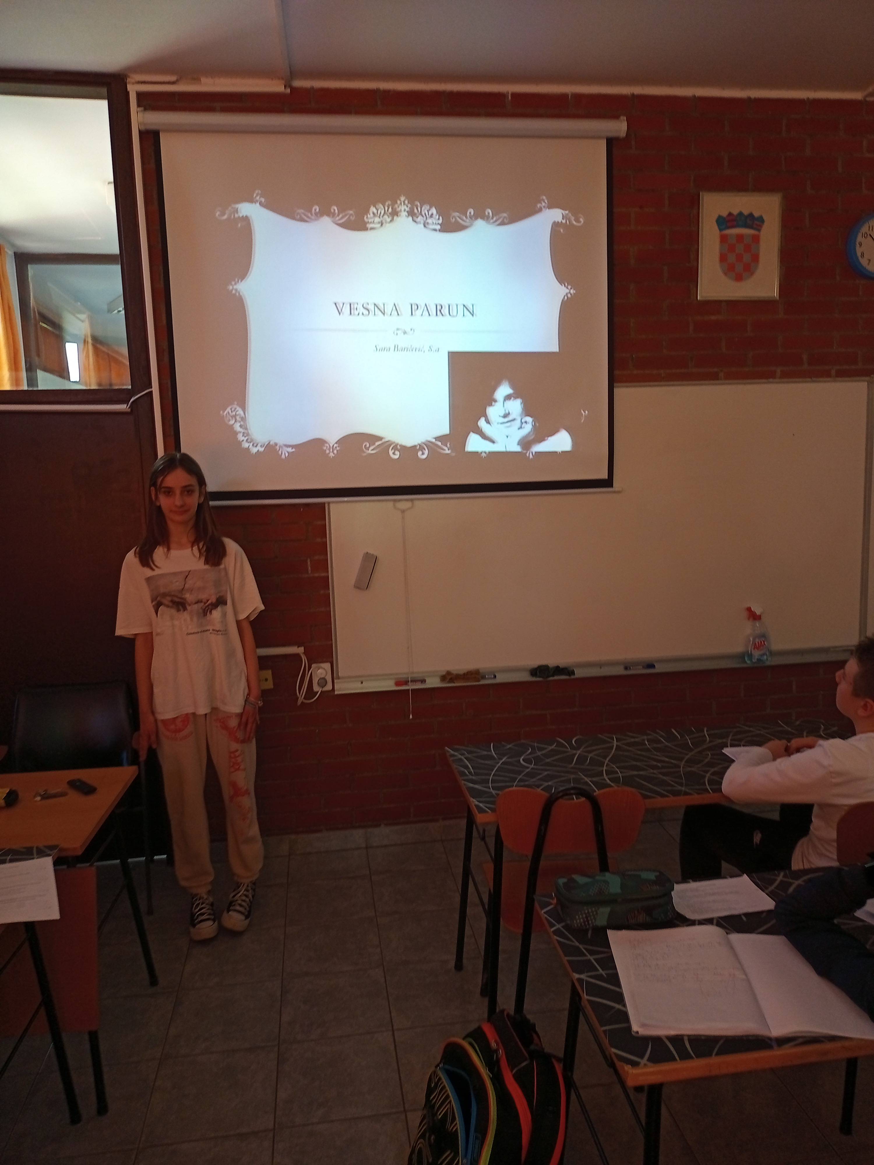 Učenici 8.a pročitali su za lektiru odabrane pjesme Vesne Parun iz njezine prve zbirke „Zore i vihori“ objavljene 1947. godine. Učenica Sara Baričević napravila je izvrsnu i detaljnu prezentaciju o najvećoj hrvatskoj poetesi, rođenoj 10. travnja 1922. na otoku Zlarinu. Svečano i dostojanstveno obilježili smo njezin 100. rođendan. Bio je to pravi praznik poezije! Fotografije u prilogu. Mirjana Miljković