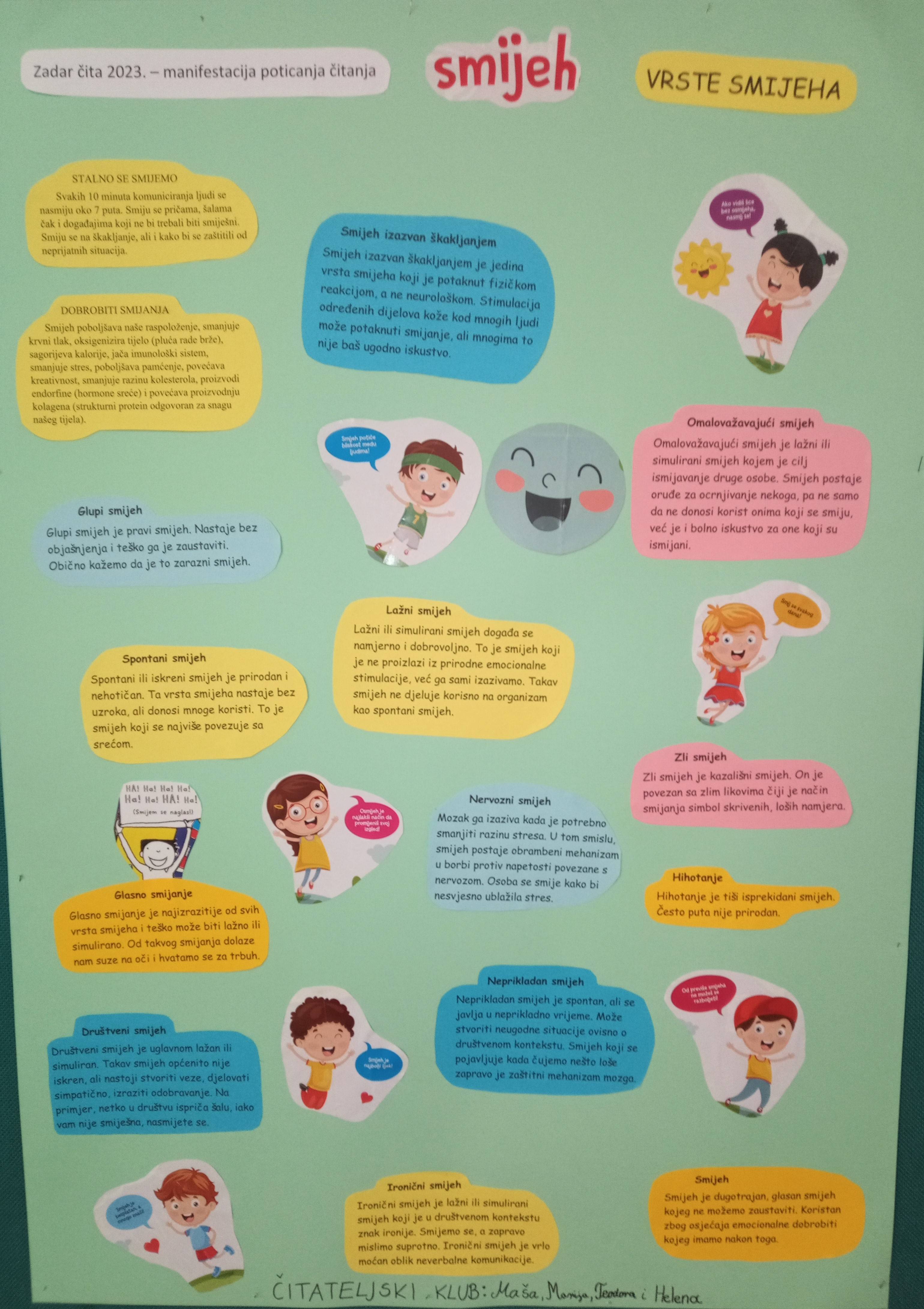 Učenici su doznali da smijeh poboljšava raspoloženje, smanjuje krvni tlak, sagorijeva kalorije, jača imunološki sustav, smanjuje stres, poboljšava pamćenje, povećava kreativnost, smanjuje razinu kolesterola, proizvodi hormone sreće. Stoga, smijmo se što više i što češće!