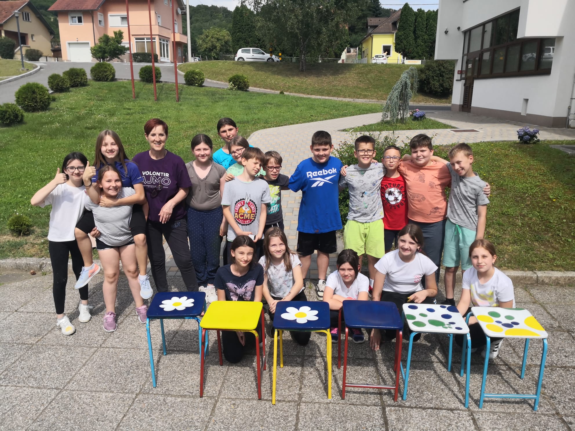 Učenici 4.b razreda pripremaju školu za dolazak novih prvašića na jesen. Jučer su uredili prostor ispred ulaza u školu i obojali stolce za knjižnicu.