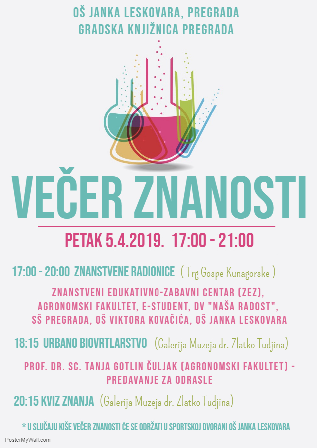 Nadamo se lijepom vremenu jer je Večer znanosti planirana za petak 5. 4. 2019. na Trgu Gospe Kunagorske, i u Galeriji Muzeja dr. Zlatko Tudjina.