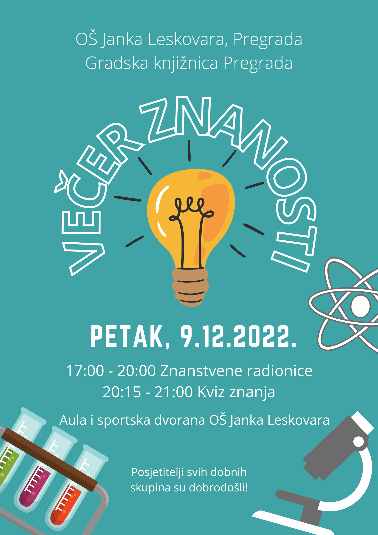 Večer znanosti već je uhodani zajednički projekt OŠ Janka Leskovara i Gradske knjižnice Pregrada, a ove godine priključio nam se i Muzej grada Pregrade. Projekt se provodi uz potporu Grada Pregrade. U sklopu ovogodišnje Večeri znanosti do sada su zainteresirani posjetitelji u Gradskoj knjižnici slušali o 3D printanju, a u Muzeju o proširenoj stvarnosti.