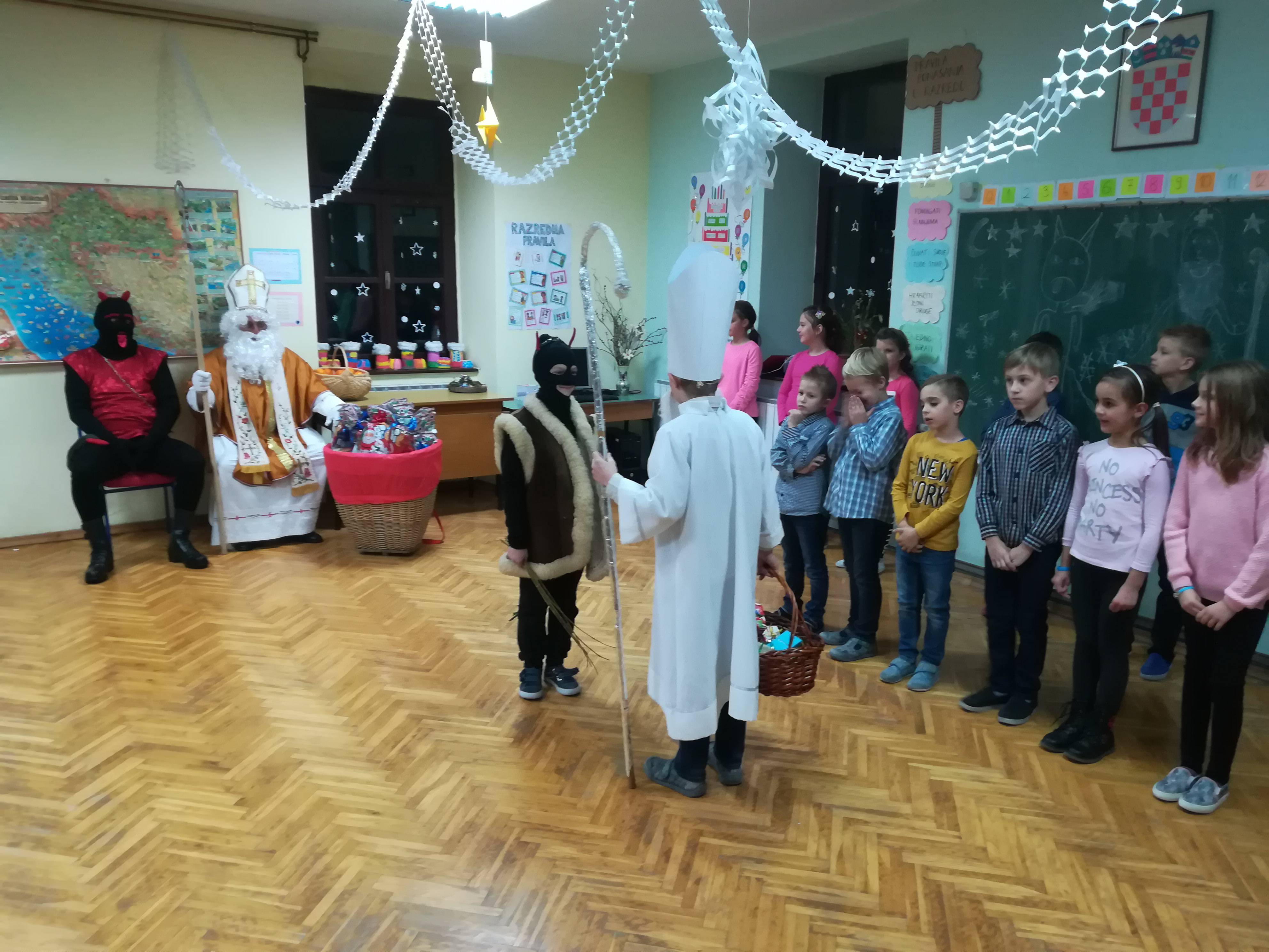 I u našu je školu danas došao sveti Nikola u pratnji svog vjernog suputnika krampusa. Povodom blagdana Sv. Nikole pripremili smo malu priredbu. Na početku su se okupljenima obratili gradonačelnik grada Pregrade i velečasni iz Kostela koji je ujedno i blagoslovio sve prisutne. Uslijedila je priredba bogata recitacijama, pjesmom i plesom, a na kraju su sveti Nikola i krampus dječici podijelili darove. Ovim putem zahvaljujemo roditeljima, bakama, djedovima, djeci, ostalim uzvanicima, ravnateljici, gradonačelniku, velečasnom te udrugama "Kostelska pištola" i "Kostelska žena". Udruga "Kostelska pištola" i Grad su jučer podijelili darove učenicima PŠ Kostel. Kostelske žene su danas za sve okupljene pripremile mali domjenak uz ukusne kolače te osigurale rekvizite i odjeću našim putnicima koji ovaj dan obilaze kuće i stavljaju poklone u čizmice :)