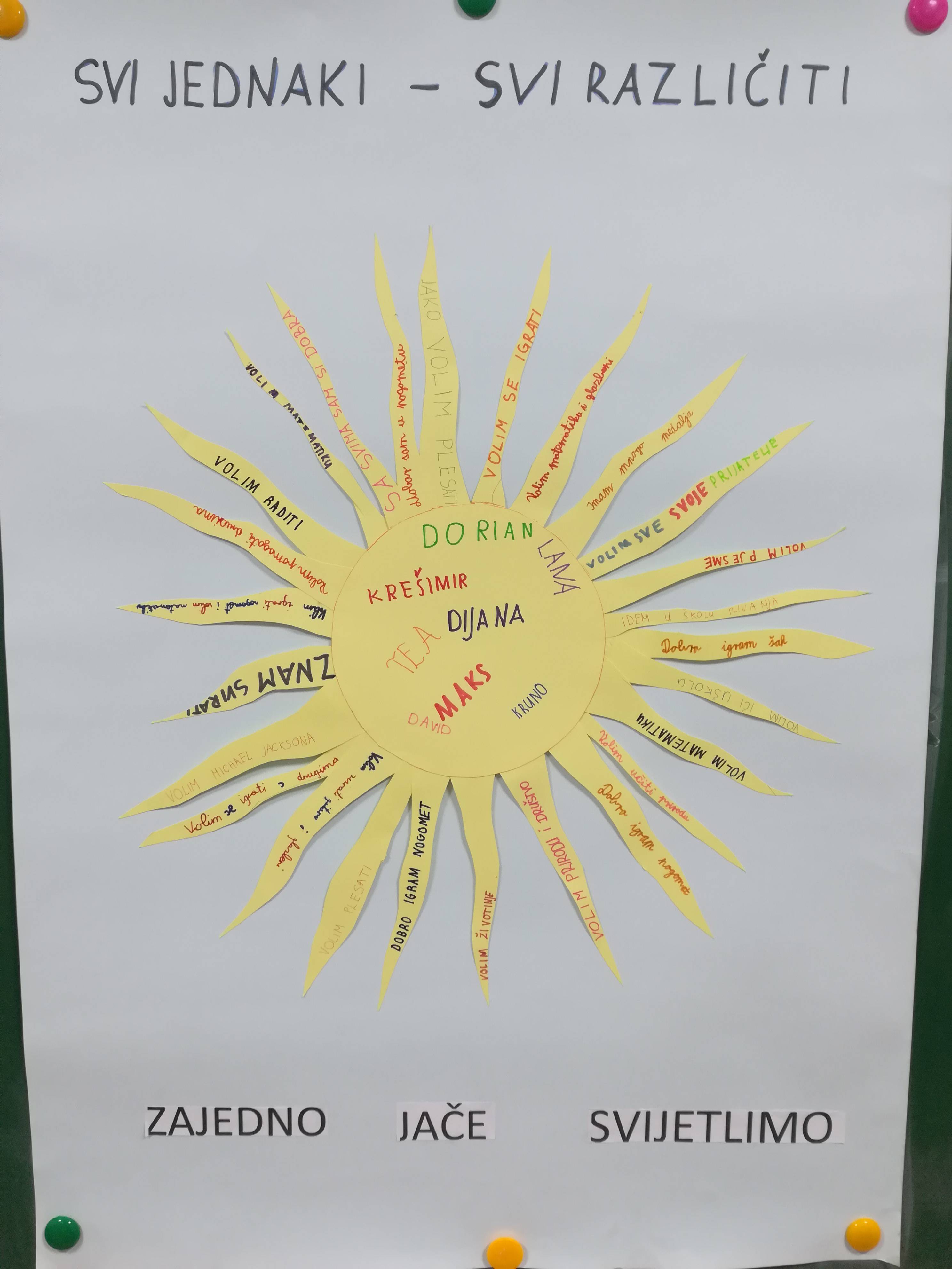 Povodom Dana tolerancije učenici 1.i 2. razreda su taj dan obilježili 13.11. na SRO i 14.11. cijeli dan, nazvavši taj dan danom ludih frizura kojima smo istaknuli svoj osobni identitet, ukazali na različitosti i prihvaćanje istih. U utorak, 13.11. na SRO napravili smo sljedeće: prvo smo odigrali igru "Dvorac". Po završetku igre učenici su opisivali kako su se osjećali oni koji su uspjeli ući u dvorac, a kako oni koji su ostali izvan dvorca. Zatim su sami zaključili i predložili kako se trebamo ponašati jedni prema drugima da bi se svi osjećali dobro i sigurno. Nakon igre upoznali smo se malo bolje na način da je svaki učenik rekao i / ili pokazao što voli, što ga zanima i o čemu zna više od ostalih. Na kraju sata izrađivali smo narukvice prijateljstva i poklonili jedni drugima, imajući na umu sve što smo naučili ili čuli o prijatelju i o njegovim interesima. Učenici 3. i 4. razreda su imali radionicu "Svi jednaki - svi različiti; Zajedno jače svijetlimo". Svaki učenik je u zraku sunca trebao napisati što voli, u čemu je dobar, koji su njegovi interesi, a u sredinu su se svi potpisali.