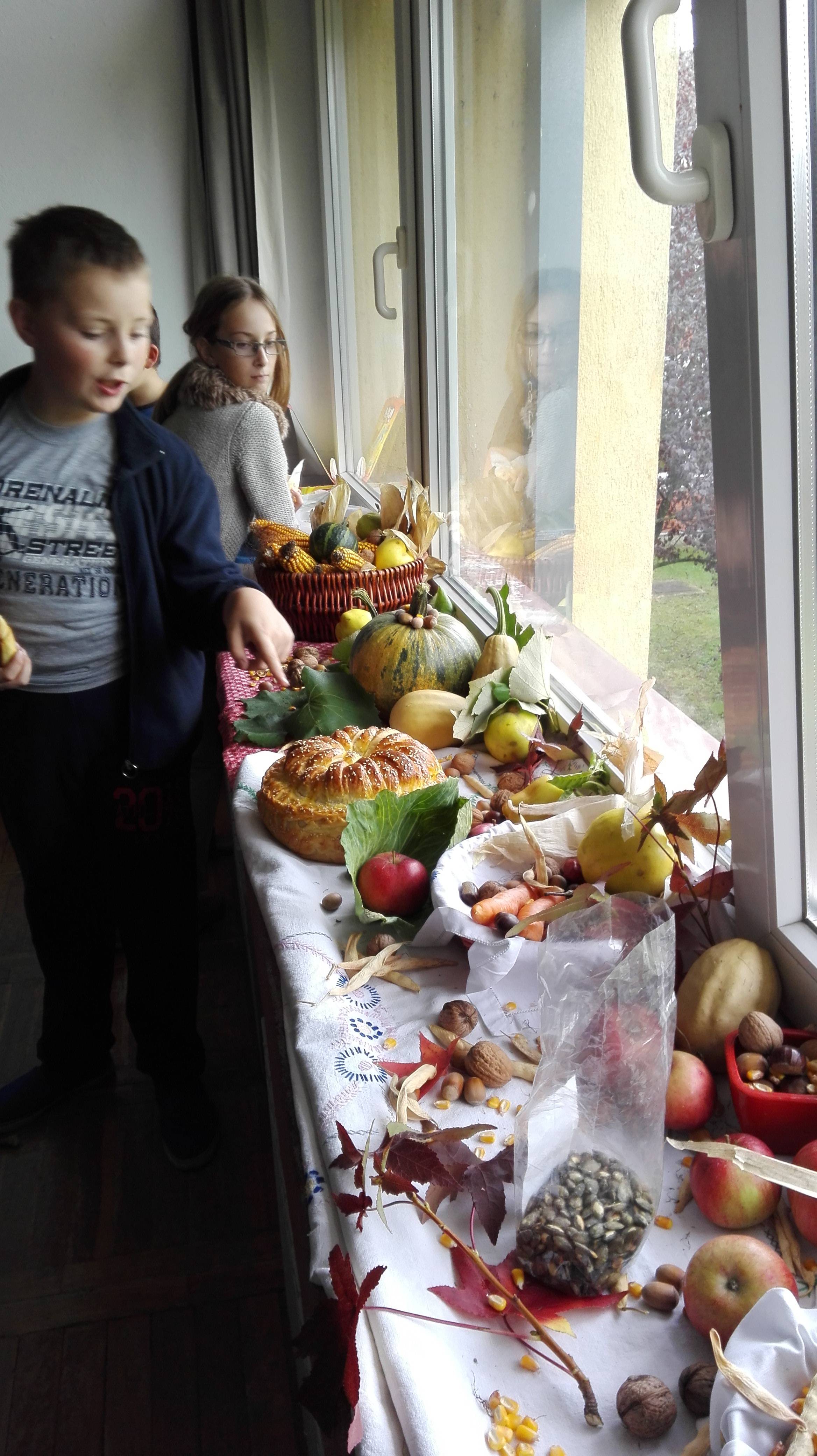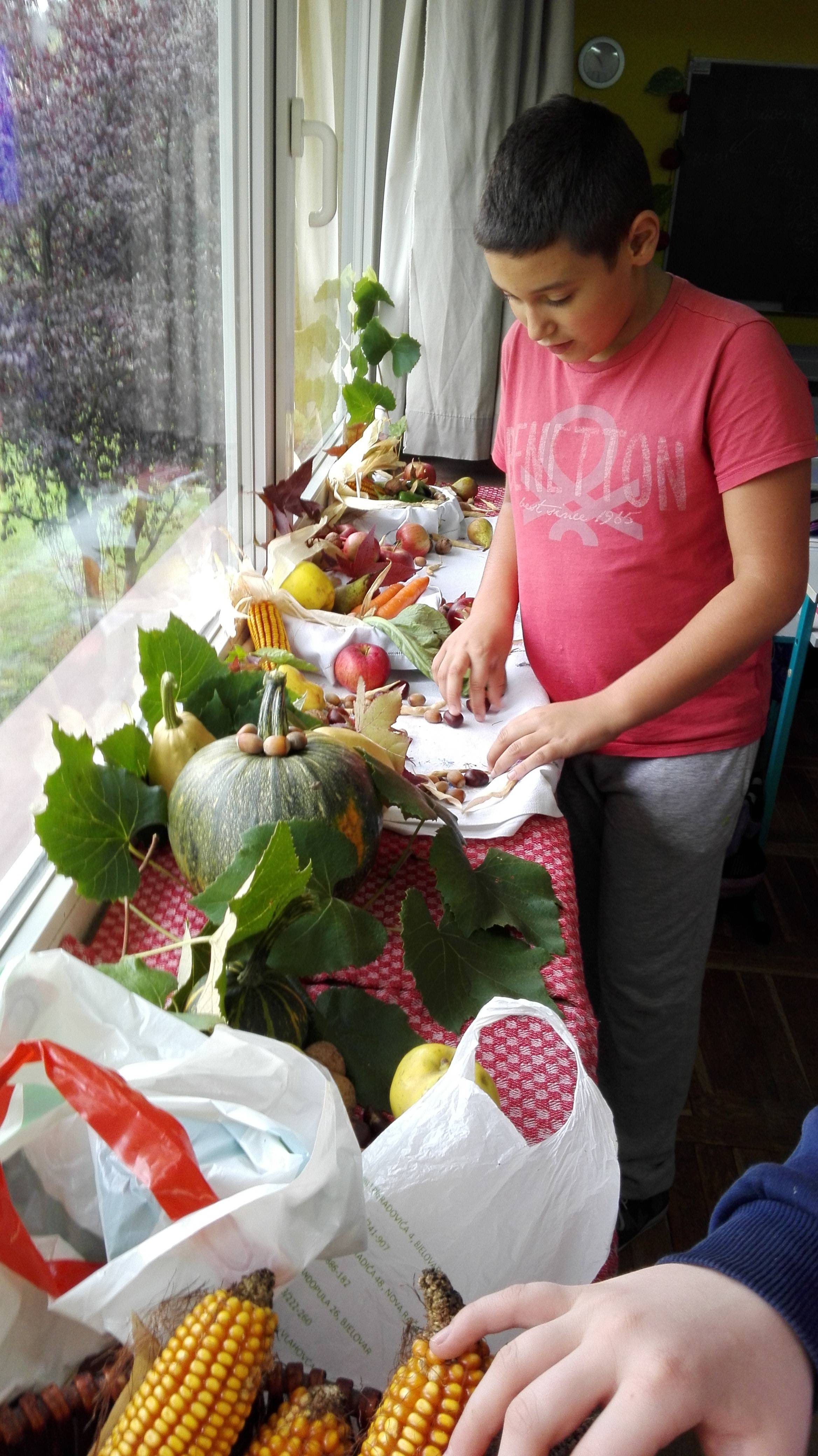 10. 10. 2017. na Dan zahvalnosti za plodove zemlje u našoj smo učionici upriličili malu proslavu. Donijeli smo jesenske plodove i izložili ih kraj naših prozora. Bundeve, tikvice, grah, kestene, orahe, lješnjake, jabuke, paprike, mrkve i kukuruz samo su neki od plodova prirode za koje smo zahvalili. Budući da svi učenici našeg razreda polaze nastavu Vjeronauka, razrednica je izrekla molitvu zahvale, kojoj su se pridružili i učenici. Osim na hrani kojom je naša domovina tako bogata, zahvalili smo i na našem razrednom zajedništvu, na našim roditeljima i učiteljima. Nakon zahvalne molitve počastili smo se kruhom i kolačima koje su mnogi učenici pripremali zajedno s mamama i bakama. Sve je bilo vrlo ukusno, a posebno su se tražile Matkove mirisne fritule i Lorenin predivni kruh.