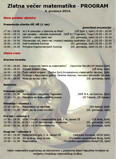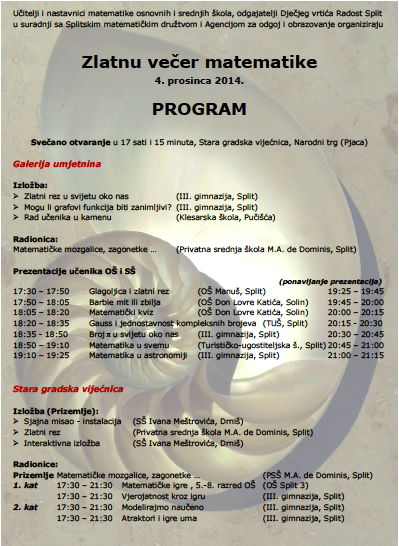 Učitelji i nastavnici matematike osnovnih i srednjih škola, odgajatelji Dječjeg vrtića Radost Split u suradnji sa Splitskim matematičkim družtvom i Agencijom za odgoj i obrazovanje organiziraju Zlatnu večer matematike 4. prosinca 2014. u 17 sati i 30 minuta.