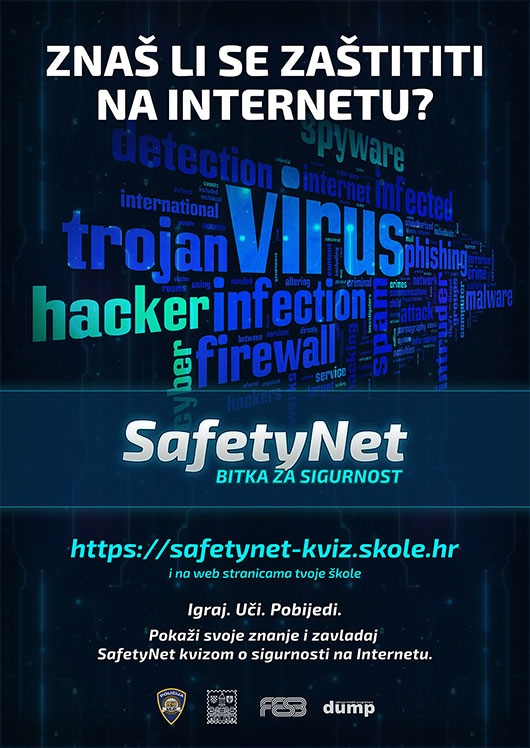 SafetyNet je zabava za cijelu obitelj! Igrajući kviz učite o sigurnosti, ponašanju na Internetu, društvenim mrežama i ostalim aktualnim temama. Materijali su prilagođeni uzrastu od 5. do 8. razreda osnovne škole.