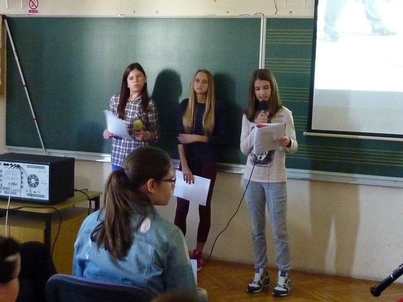 Prikazana je i prezentacija iz koje smo saznali da su mnoge poznate osobe bile iznimno uspješne unatoč sljepoći te da je pismo kojim se danas koriste slijepi ljudi izumio Louis Braille. Učenica Ana Mudnić Dujmina pročitala nam je ulomak iz romana „Bijeli klaun”. Za kraj naša je Anđela odsvirala na klaviru skladbu Johanna Sebastiana Bacha “Ah, što volim” što su svi prisutni nagradili velikim pljeskom.