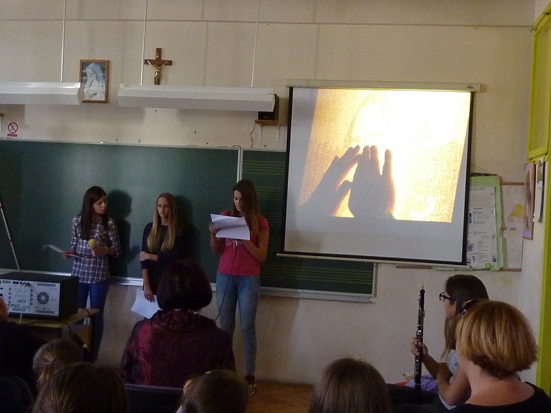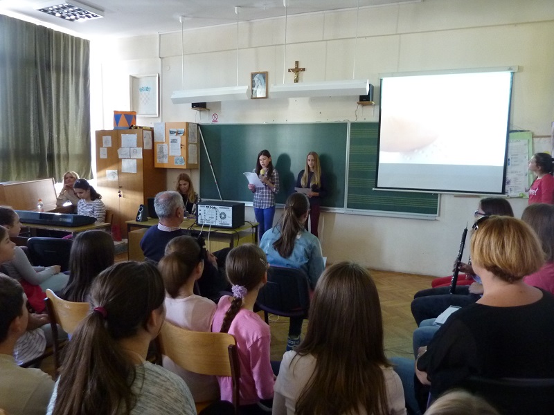 Svečanost je održana u učionici Glazbene kulture, a voditeljice programa bile su učenice Mirjam Lejo i Paula Marić. Program je započeo pjesmom „Veličanstven znak“ koju su odsvirale Sara Popović i Mihaela Boljat. Nakon toga učenica Mara Kelava pročitala nam je pjesme „Slijepac pjeva svome gradu“ Abdulaha Sidrana i “Tvrđava koja se ne predaje” Jure Kaštelana.