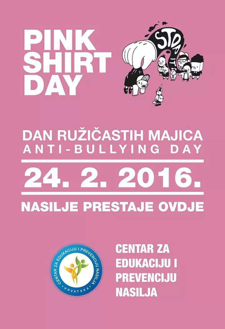 Pridružite se i vi obilježavanju Dana ružičastih majica! Pozovite prijatelje i radne kolege da na dan 24. veljače 2016. nose ružičasto i podrže program prevencije vršnjačkog nasilja. Na stranici https://www.facebook.com/CentarzaEdukacijuiPrevencijuNasilja pročitajte više i pogledajte tko se sve pridružio inicijativi. Vidimo se sutra u ružičastom!