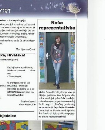 Hrvatska plivačka reprezentativka, članica Mornara iz Splita Matea Samardžić ostvarila je veliki uspjeh osvojivši brončanu medalju na Europskom prvenstvu u Londonu. Natjecala se u disciplini 200 metara leđno gdje je mjesto na postolju izborila s novim hrvatskim rekordom 2:09.24. Vrlo smo ponosni jer je Matea bivša učenica naše škole, koja je 8. razred završila 2009. godine. U nastavku prenosimo tekst iz ''Slobodne Dalmacije'', a imamo i stare Mateine slike iz ''Maslačka''.