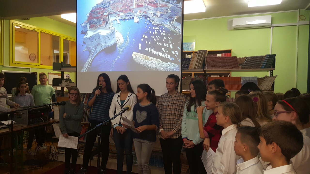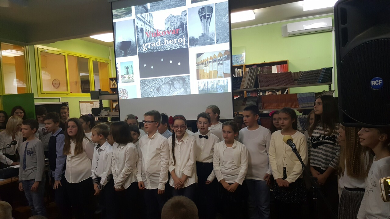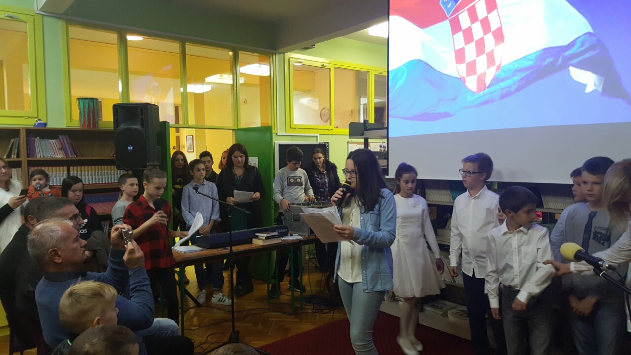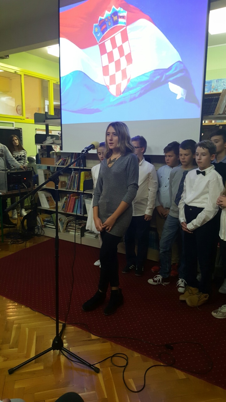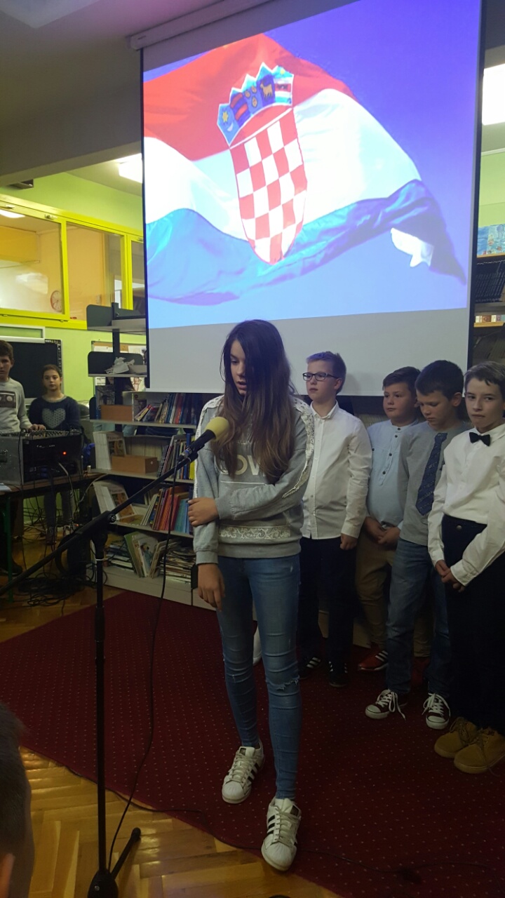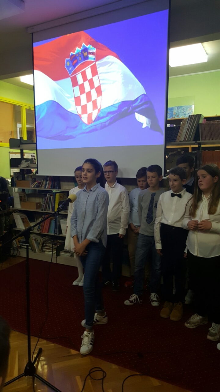 Program je započeo izvedbom školskoga zbora pod vodstvom nastavnice Zlatke Bakotić koji je otpjevao Lijepu našu, a zatim smo čuli domoljubne stihove velikih hrvatskih pjesnika koje su izvele Petra Leskur, Mia Banjan, Eni Marinelić i Lucija Gavro te u zajedničkom nastupu učenice 5. c razreda Laura Jozinović, Sara Ema Bjelobaba, Danni Dević, Nikolina Milić, Petra Veštić i Lana Serdarević.