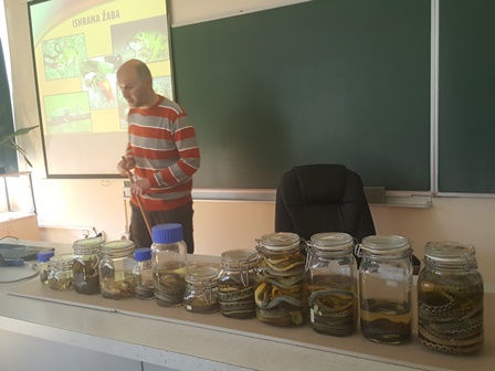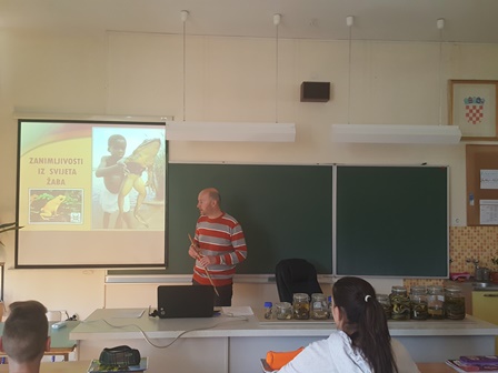 Jučer su šestaši imali neobičan sat Prirode - nastavnica Silvana Mijić pozvala je profesora Tina Milata iz Prirodoslovnog muzeja da im održi radionice o žabama i zmijama. Učenici su bili oduševljeni što su imali priliku izbliza vidjeti ova neobična i zanimljiva stvorenja.