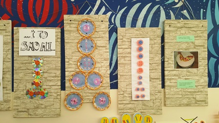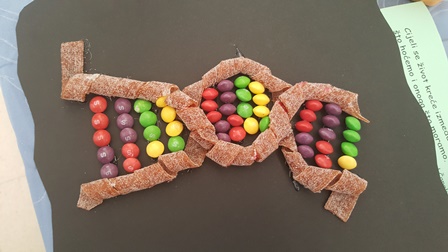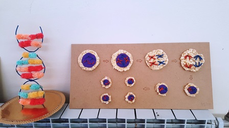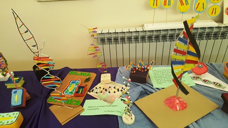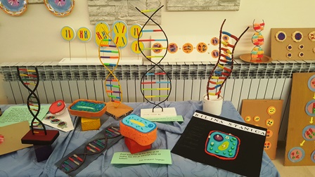 Školski zadatak koji su osmislile nastavnice Silvana Mijić i Gabrijela Bradarić Bitanga za petaše (izrada modela stanice), sedmaše (mitoza i mejoza) te osmaše (DNA) dobio je oblik izložbe - najuspješniji radovi izloženi su u atriju. Učenici su morali izraditi modele, plakate i slično, s materijalima po izboru te svoj rad za ocjenu prezentirati pred razredom. Odabir materijala za rad najzanimljiviji je od svega - bilo je tu drva, gline, plastelina, rižinih keksića, vune, plastike, spužvi i slično. Jestivi radovi u obliku torte i keksića nažalost nisu dočekali izložbu![]()