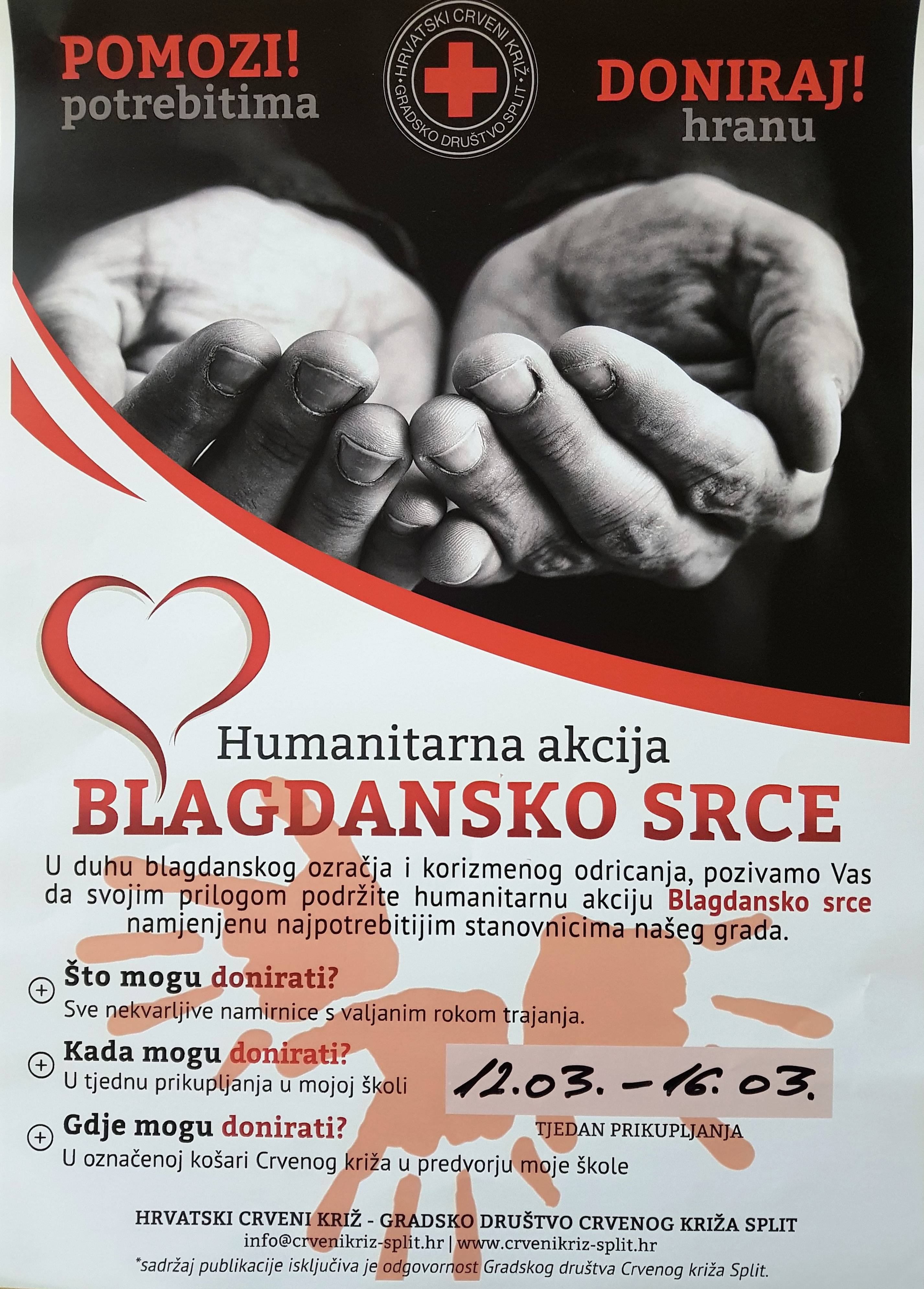 Pozivamo sve učenike da se zajedno sa svojim obiteljima priključe humanitarnoj akciji splitskoga Crvenog križa ''Blagdansko srce'' tijekom koje će se prikupljati hrana (nekvarljiva) i higijenske potrepštine za naše potrebite sugrađane. Svoje donacije možete ostaviti u kutijama koje će biti postavljene u atriju škole od 12. 3. (ponedjeljak) do 16. 3. (petak). Unaprijed vam hvala!