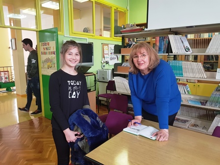 Naša školska kulturno-jezična manifestacija trajala je do 22. ožujka kada smo ugostili književnicu Branku Primorac, autoricu rado čitane lektire Maturalac. Književnica je po drugi put posjetila našu školu i naišla na srdačan doček. Naime, učenici 7. c uprizorili su ulomak iz njezinog romana, učenice 8. a Petra Bužančić i Mia Banjan izradile su majstorski plakat s motivima iz spomenute lektire, a učenica Mia Kelava (8. a) pripremila je kratak uvod i pozdravila književnicu. Gospođa Primorac govorila je o svom životu, kako i zašto je počela pisati, kako su nastala njezina djela... Izlaganje je upotpunila zanimljivim detaljima iz privatnoga života, a učenike je zadivio podatak da nikada nije bila na „maturalcu“ o kojem je tako uvjerljivo pisala. Zatim su uslijedila brojna pitanja učenika kojii su pokazali veliko zanimanje za ovaj književni susret.