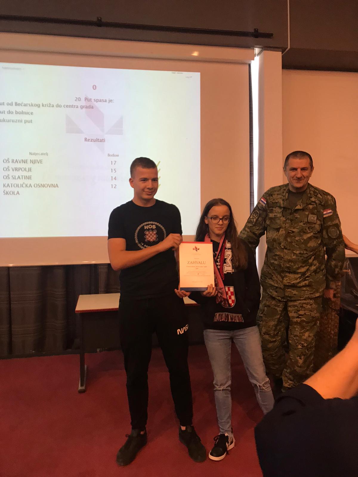 Naša tuga uskoro se pretvorila u vedrinu. Predavanje pod nazivom Škola mira brigadira Petra Ćavara ukazalo nam je na važnost uspostave mira i prihvaćanja općeljudskih vrijednosti kako se ovakva tragedija rata ne bi ponovila… Svatko od nas treba težiti uspostavi mira. Osim mira, važno je i imati znanje o Domovinskome ratu, što smo uspješno dokazali u međuškolskome kvizu koji se održao nakon predavanja. Naša je škola uvjerljivo pobijedila zahvaljujući vrsnim poznavateljima činjenica o Domovinskome ratu, Gabrieli Grubišić (8. a) ) i Luki Anđeliću (8. b). Brigadir Ćavar pohvalio je natjecatelje, ali i publiku koja je zdušno bodrila svoje predstavnike.