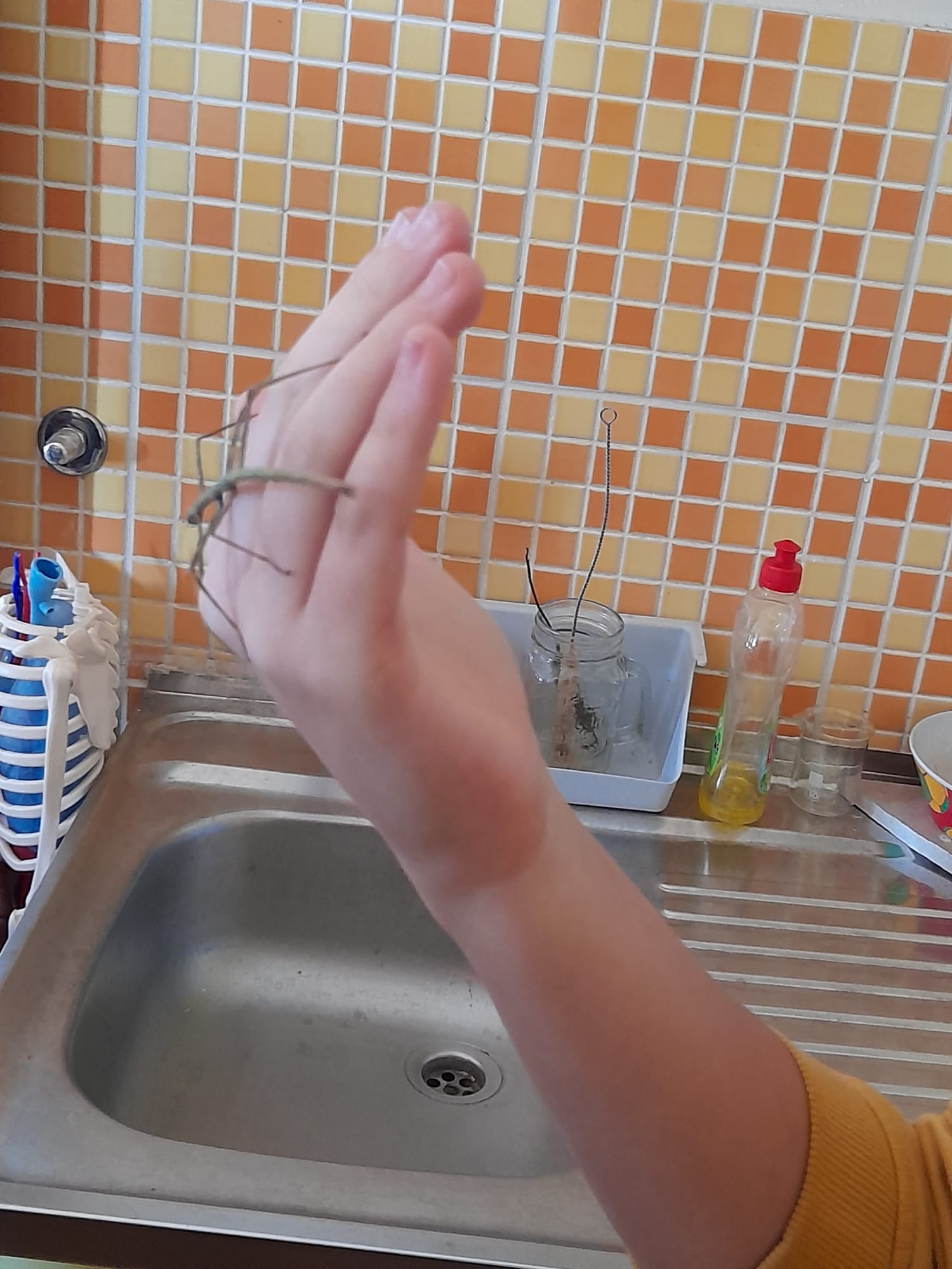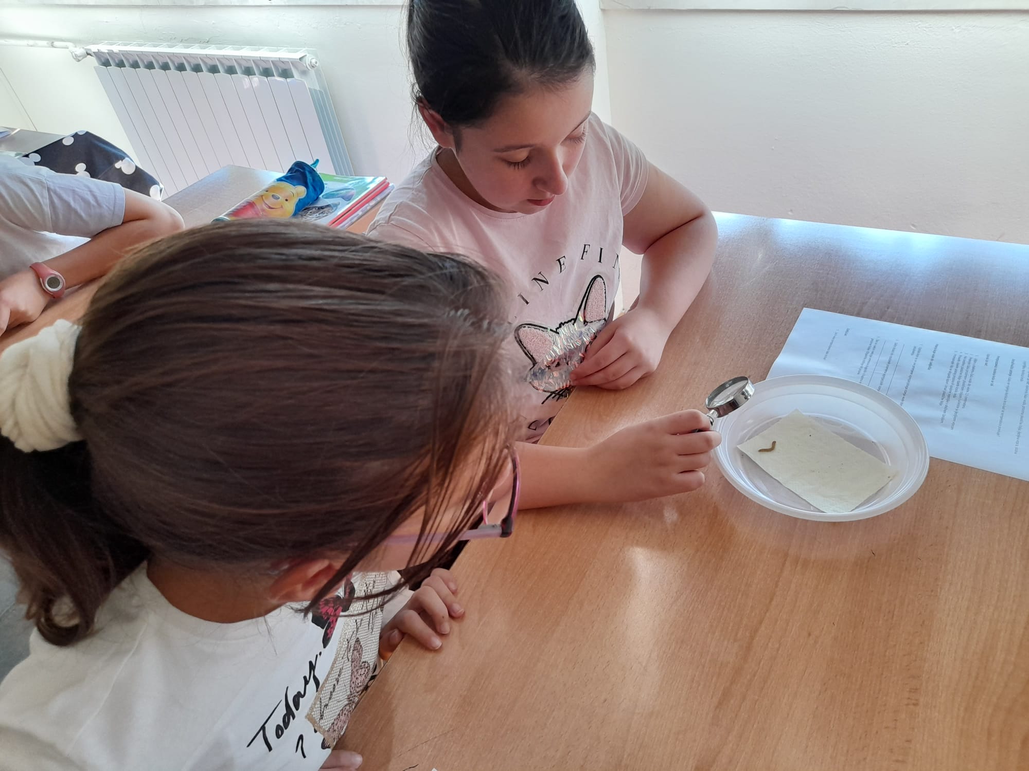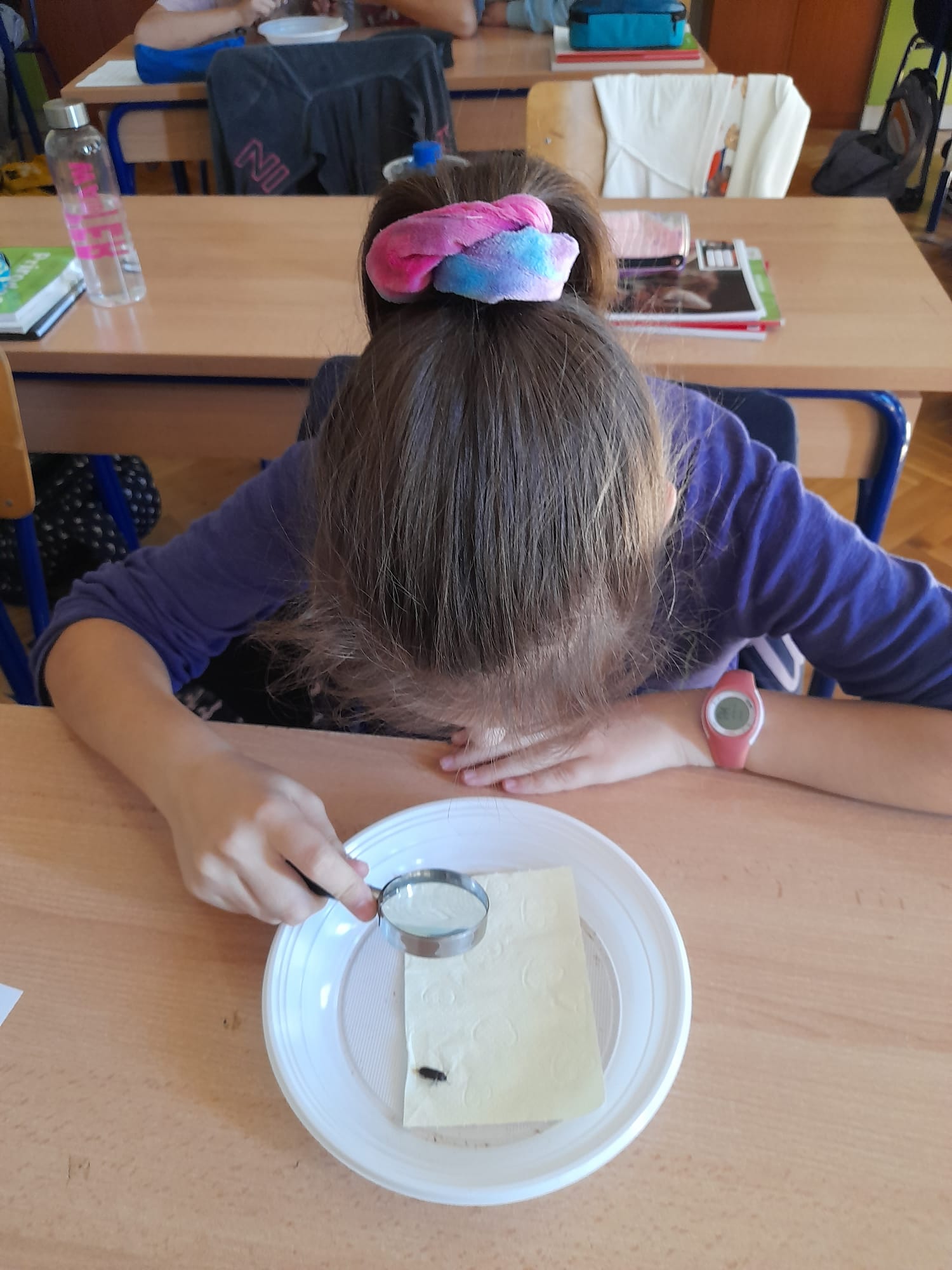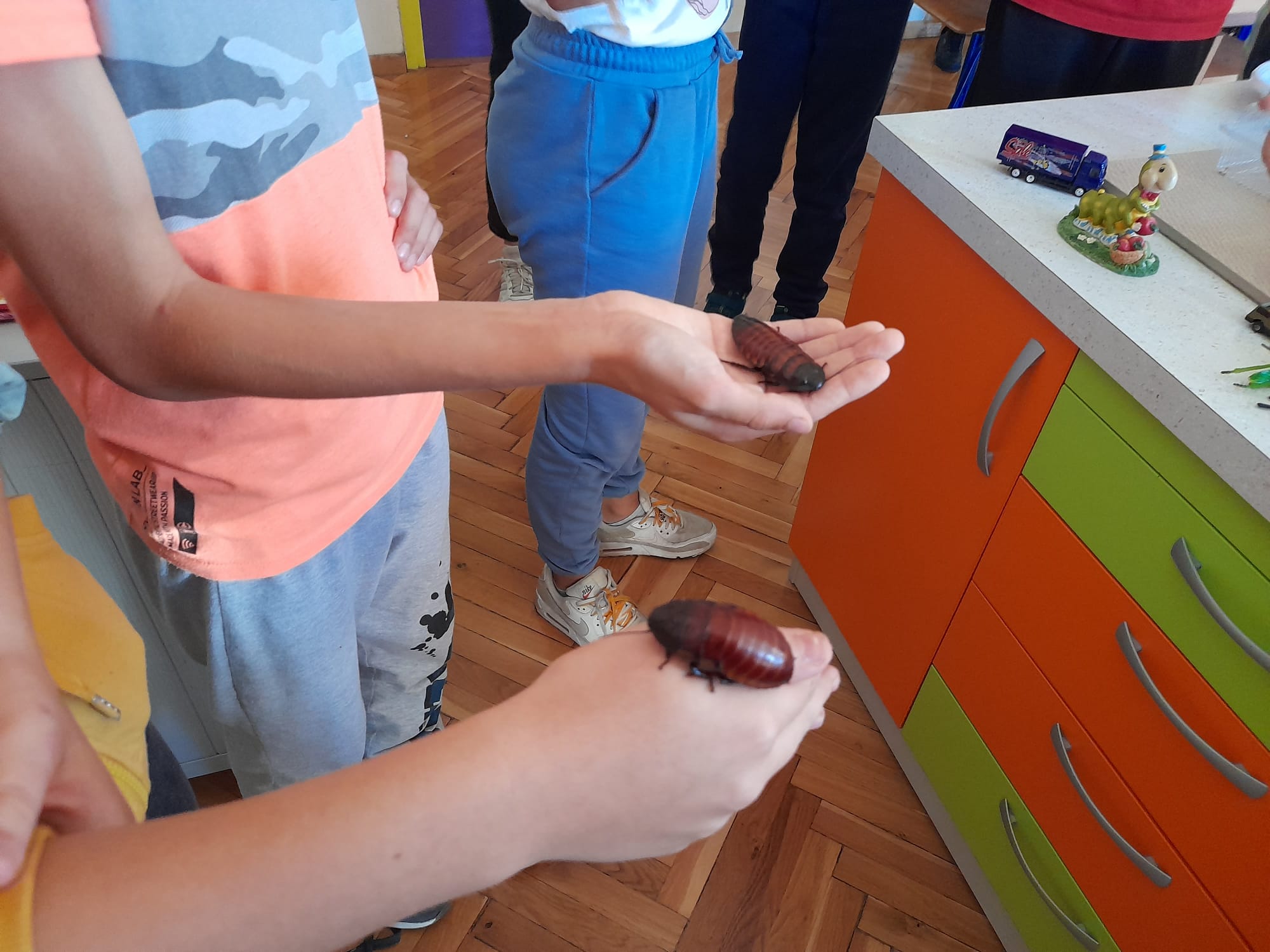 Prvo smo gledali živu kukuljicu, ličinku i žive kukce. Svi smo ih mogli dotaknuti i malo bolje pogledati. Neki su se bojali i nisu ih htjeli dotaknuti. Ja sam ih dodirnula i bilo je odlično. Nakon toga smo vidjeti kukca koji izgleda kao grančica. To je bio paličnjak. On ima posebnu moć, kada stane na stablo skoro se i ne vidi. To se zove mimikrija. Neka djeca su ga i uzela u ruke pa im je šetao po ramenu. Ja sam opet bila jedna od njih. Bilo je to zanimljivo iskustvo. Vidjeli smo još i velike žohare koji sikću - madagaskarski siktajući žohar. Taj nam je bio zastrašujuć i vrlo velik. Naježila sam se kad mi je bio na ruci. Pod mikroskopom smo gledali krilo leptira i žalac pčele. Krilo leptira je puno crta i jako lijepo za vidjeti.