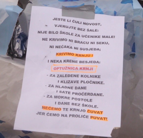Onda se priko razglasa čula Optužnica Krnji. A jesu ga uvatili! Čitala je mala prvašica.