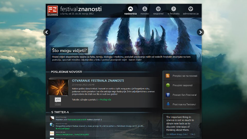 Portal Festivala Znanosti u Splitu je mjesto gdje možete saznati najnovije informacije o festivalu, uključiti se u raspravu o novostima i događajima. Možete pronaći i sva predavanja koja se ove godine održavaju u Splitu, pogledati kad se održavaju i gdje. Također, pročitajte sve o festivalu i razlozima zašto postoji, a cijelu priču možete pratiti i na Facebook-u i Twitter-u.