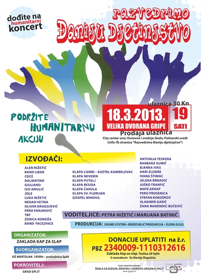 Veliki humanitarni koncert "Razvedrimo Đaniju djetinjstvo" održat će se 18. ožujka 2013. godine u Velikoj dvorani Gripe s početkom u 19.00 sati.