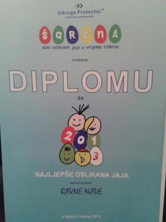 Naša oslikana jaja su bila prezentirana i na Internet stranici organizatora od 29.3 do 7.04. i tu su posjetitelji stranice mogli 'lajkati'' i ocijeniti najljepši aranžman. 9.04. proglašeni su najljepši aranžmani u dvorani Gripe uz prigodan program, a među najljepšima našao se i naš aranžman. Hvala svima koji su glasali za nas jer su usrećili male prvašiće i dali nam poticaj za daljnji rad.
