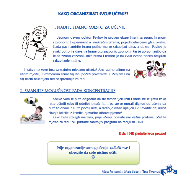 Nova školska godina mnogima donosi velike promjene. Predstoje nove obveze koje postaju veće, teže i složenije. Treba učiti više i upornije nego u prethodnim razredima. Nažalost, ponekad marljivost i upornost nisu dovoljni, jer mnogi uče marljivo i uporno, a ipak ne postižu zadovoljavajuće rezultate. U čemu je tajna? Kako uspješno učiti?